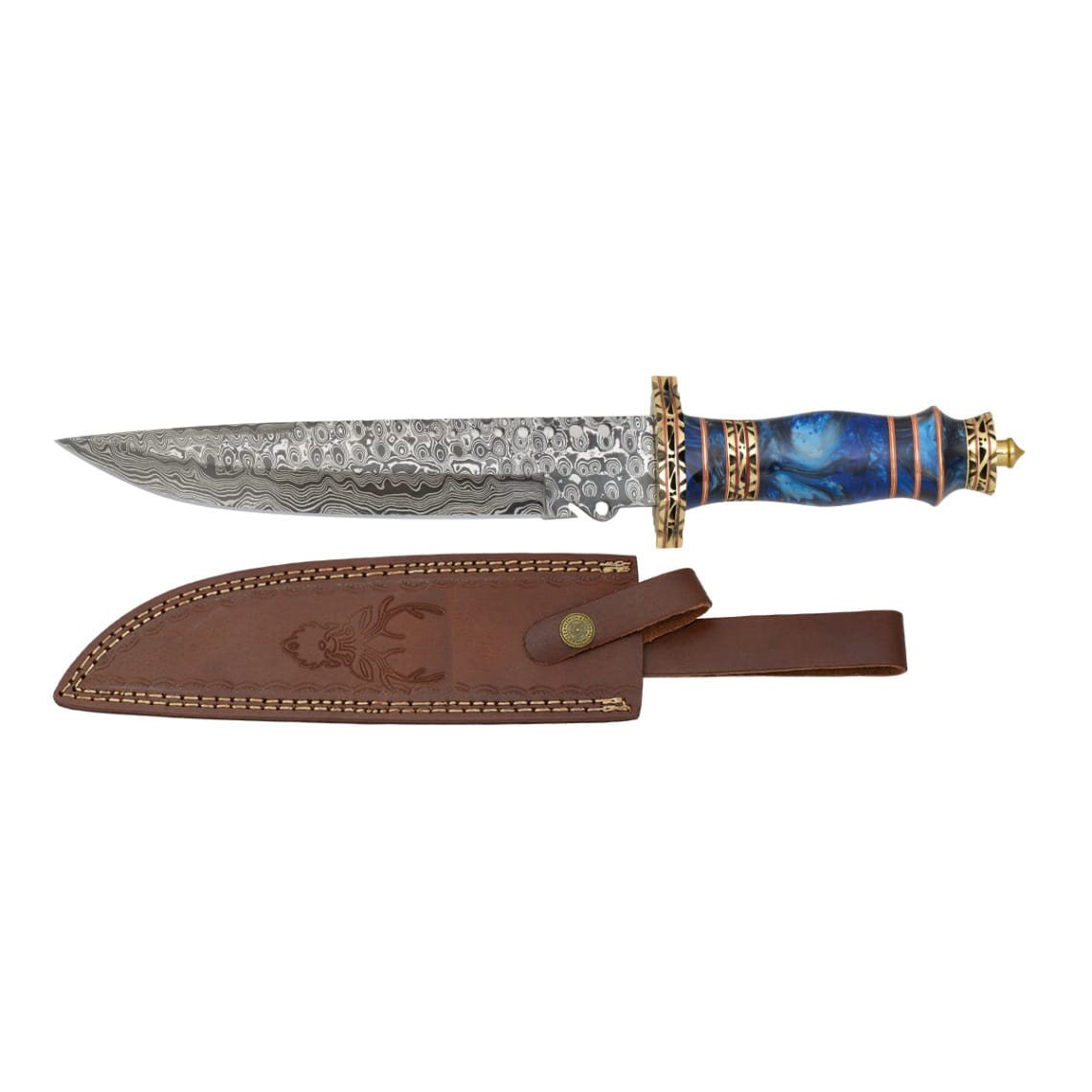 Couteau massif décoré à lame fixe, livré avec un étui en cuir. La lame à tranchant lisse est fabriquée en acier damassé de haute qualité à 312 couches. Le manche décoré est fabriqué à partir d'une combinaison de résine et de laiton, tandis que la poignée du couteau ressemble à une couronne royale. La garde en laiton massif protège efficacement la main contre les coupures. L'étui en cuir pour ceinture se ferme à l'aide d'une bande à bouton-pression et est orné d'une représentation de cerf.