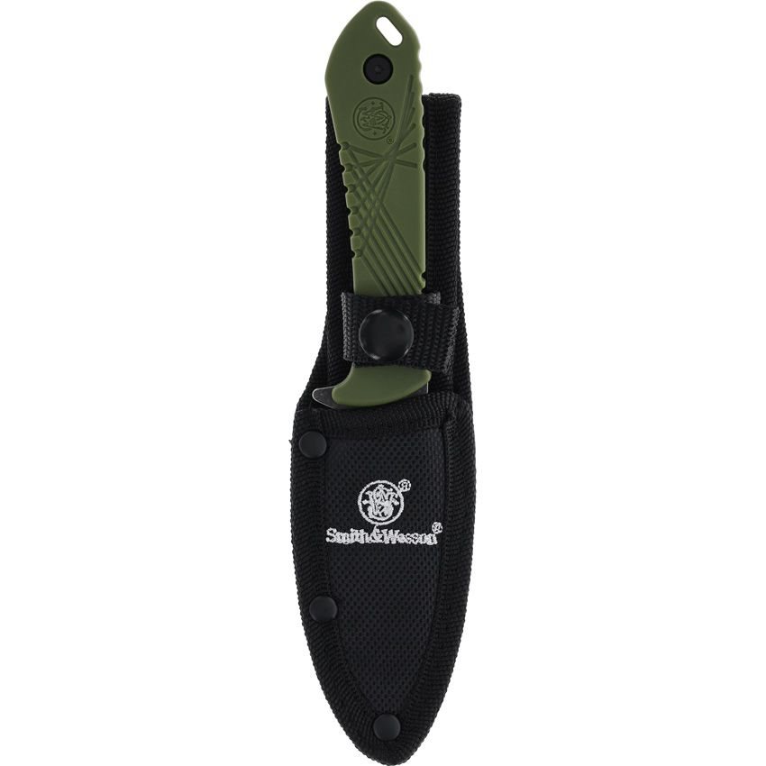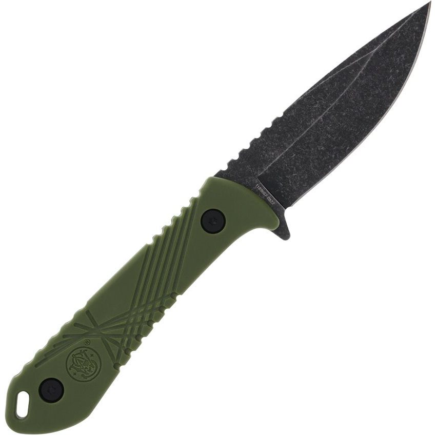 Couteau à lame fixe et construction full-tang offrant une excellente résistance dans toutes les conditions. La lame à tranchant lisse et de forme drop point est fabriquée en acier inoxydable et sa surface est recouverte d'un fin traitement stonewash de couleur foncée. Le manche du couteau est en plastique vert et comporte à son extrémité un trou permettant d'y passer un cordon de sécurité. Le couteau est livré avec un étui de ceinture en polyester noir. Le couteau est maintenu dans l'étui à l'aide d'un bouton-pression.