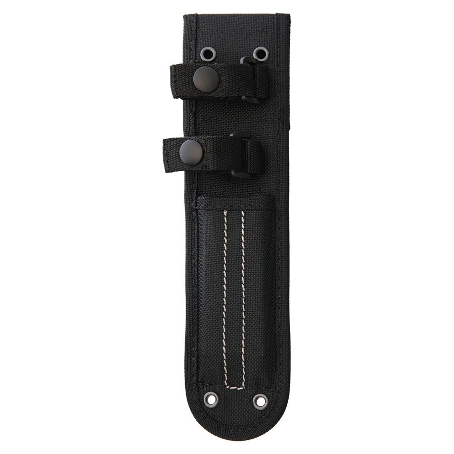L'emballage comprend un étui en nylon noir que vous pouvez attacher à une ceinture d'environ 5 cm de large ou, grâce à des sangles, fixer à un équipement (sac à dos, gilet tactique) avec une fixation MOLLE/PALS. Le couteau est maintenu dans l'étui à l'aide de deux sangles avec des boutons-pression métalliques. Fabriqué aux États-Unis.