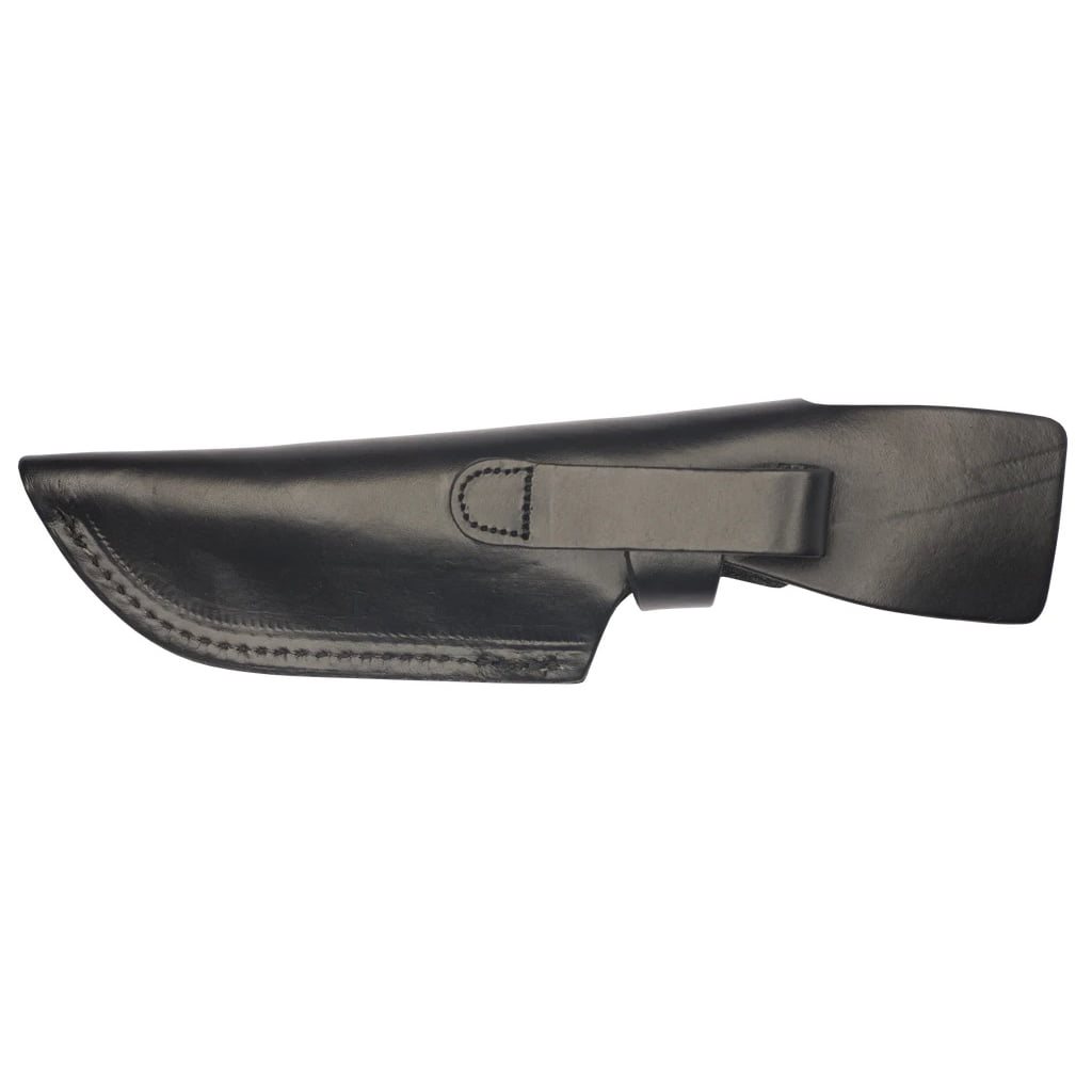 L'emballage comprend un étui en cuir noir que vous pouvez accrocher à votre ceinture. Le couteau est maintenu dans l'étui par une sangle à bouton-pression.
