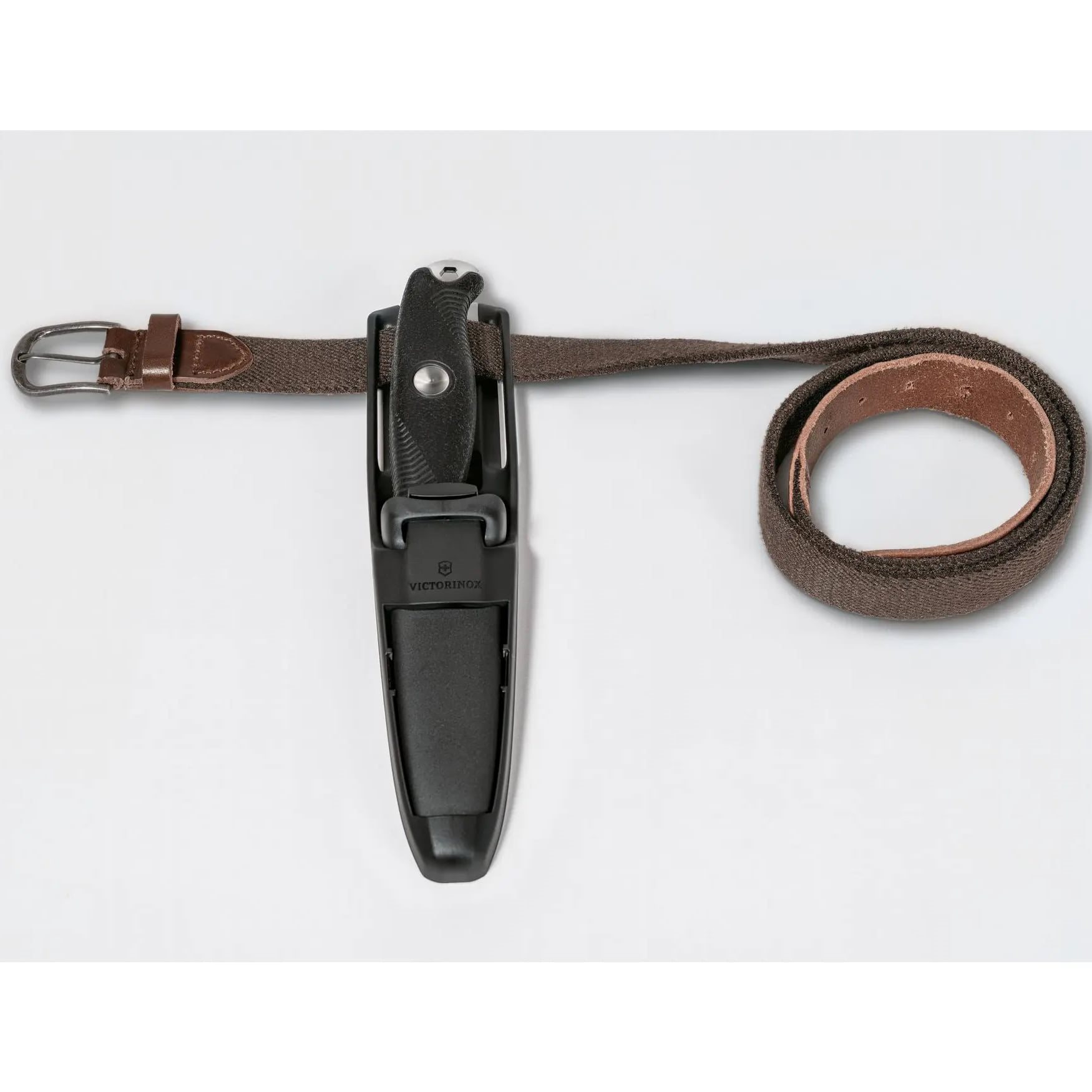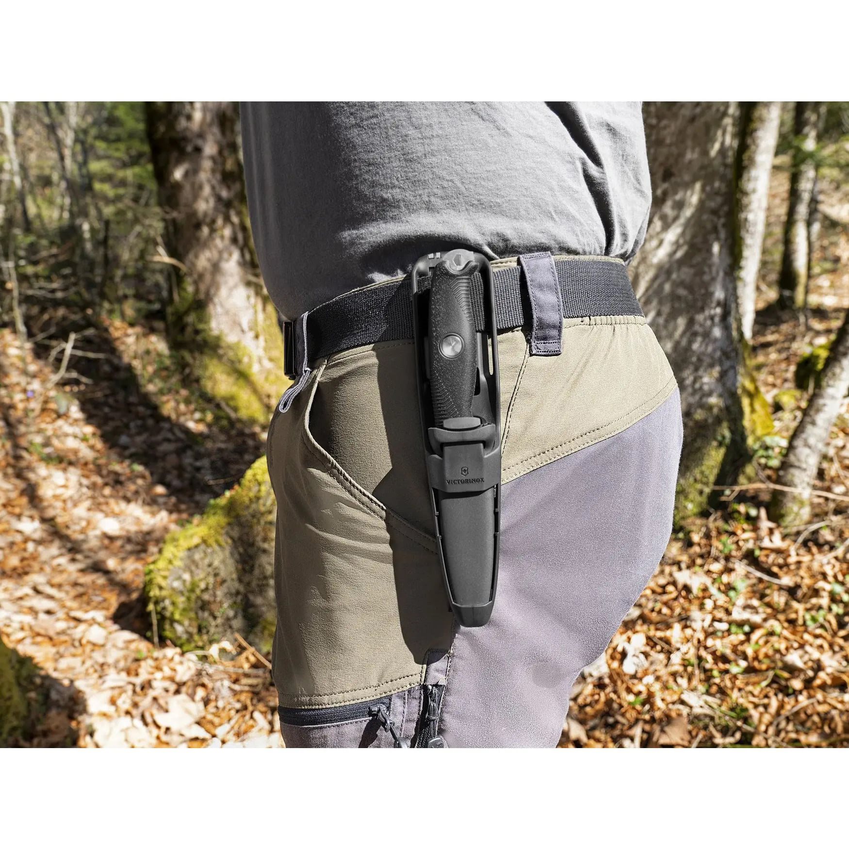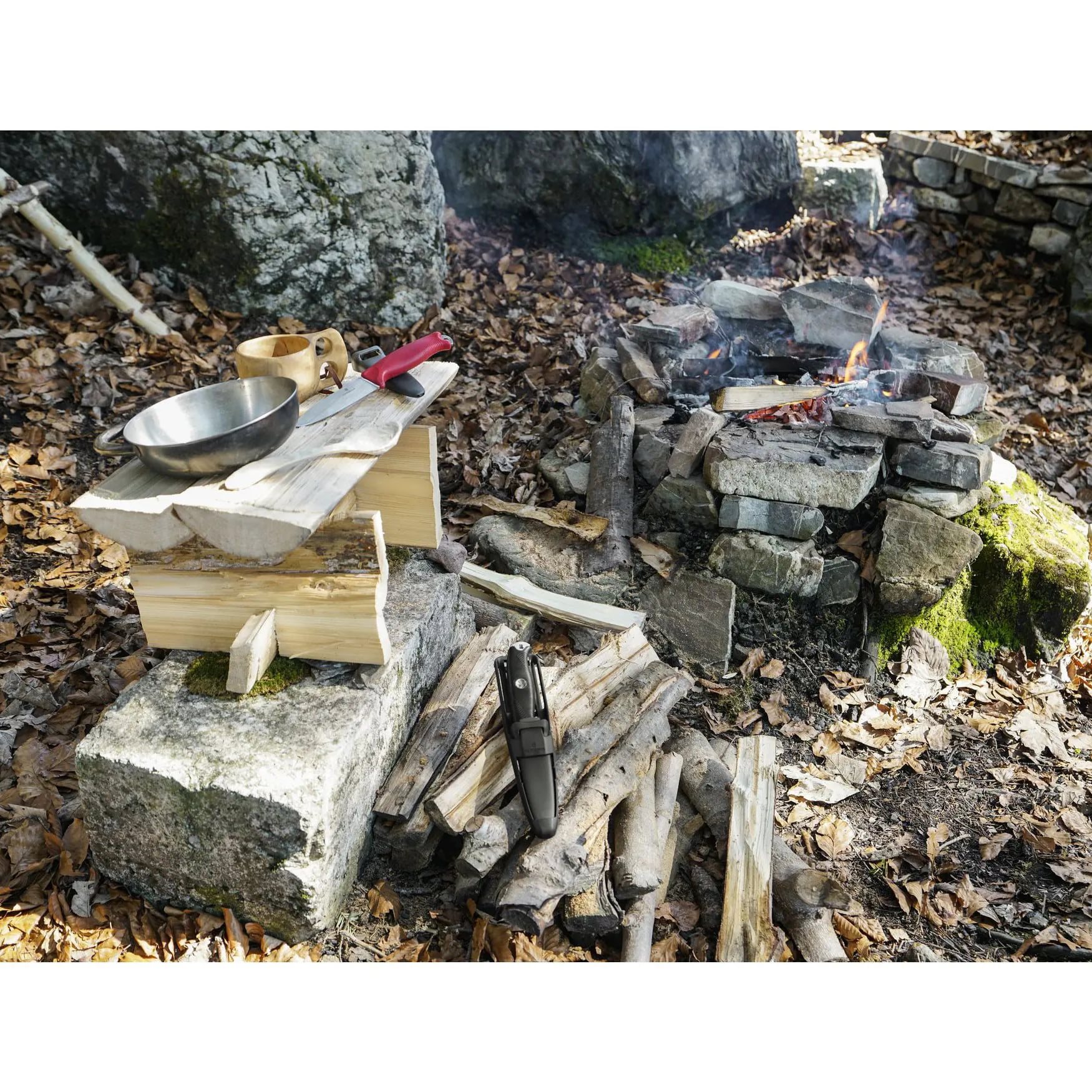 Un étui est inclus pour ranger le couteau en toute sécurité. Il est symétrique, ce qui permet d'insérer la lame dans les deux sens et convient aussi bien aux droitiers qu'aux gauchers. Les trous dans l'étui permettent à la lame du couteau de sécher suffisamment après utilisation. En fixant l'étui au couteau, on obtient un accessoire pour percer. En outre, l'étui peut également être utilisé comme souffleur efficace pour allumer un feu. L'étui contient également une pince à épiler, un stylo à bille et un briquet.