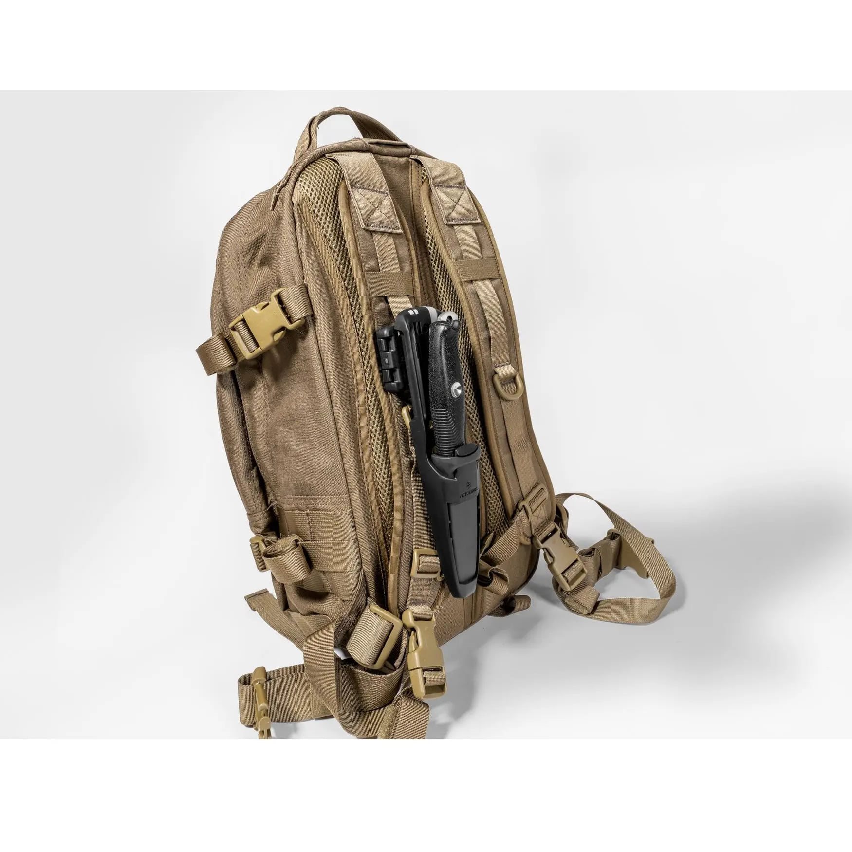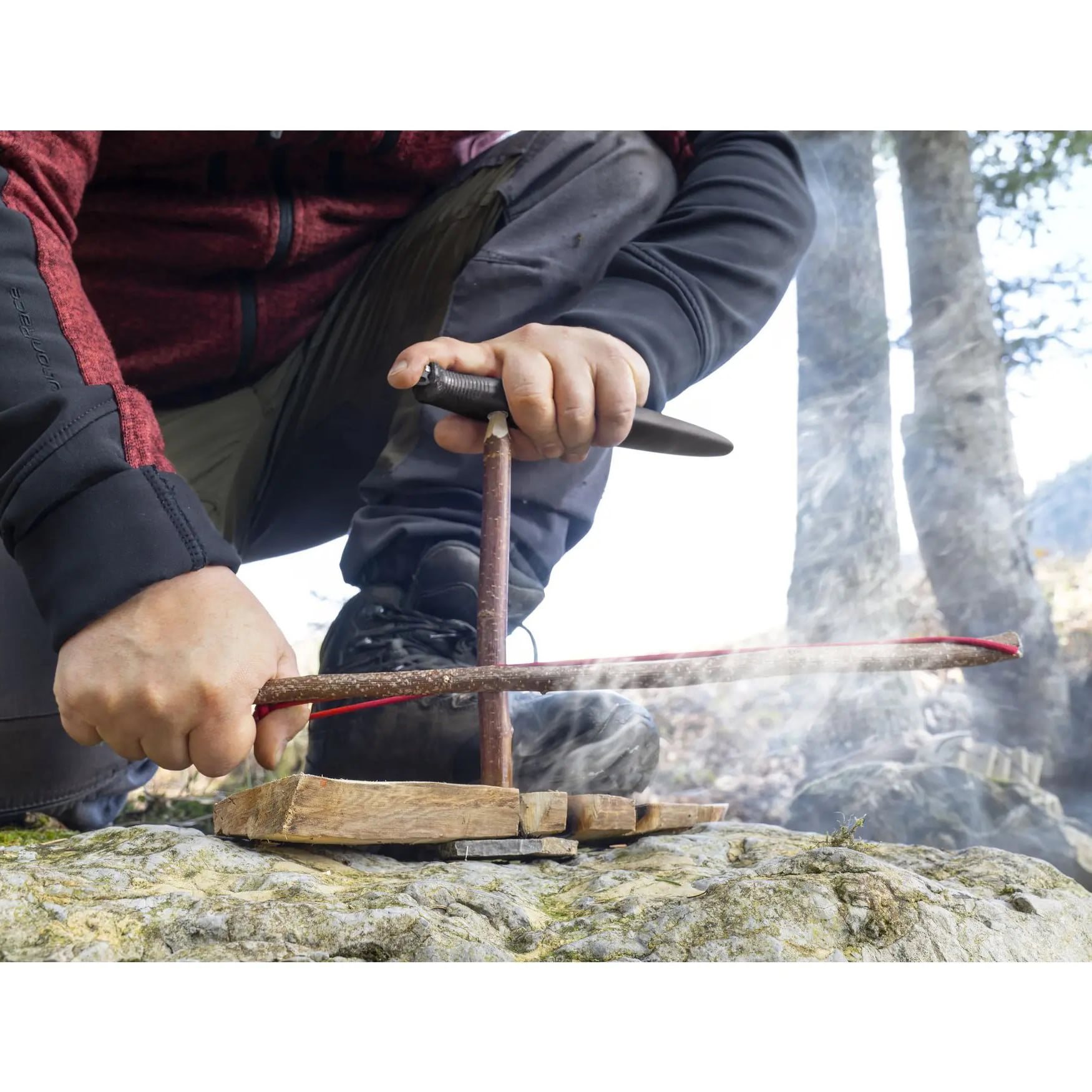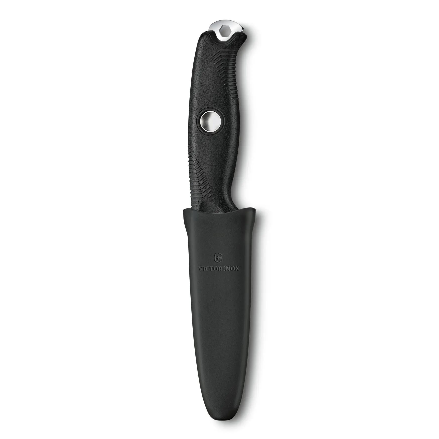 Un étui est inclus pour ranger le couteau en toute sécurité. Il est symétrique, ce qui permet d'insérer la lame dans les deux sens et convient aussi bien aux droitiers qu'aux gauchers. Les trous dans l'étui permettent à la lame du couteau de sécher suffisamment après utilisation. En fixant l'étui au couteau, on obtient un accessoire pour percer. En outre, l'étui peut également être utilisé comme souffleur efficace pour allumer un feu. L'étui contient également une pince à épiler, un stylo à bille et un briquet.