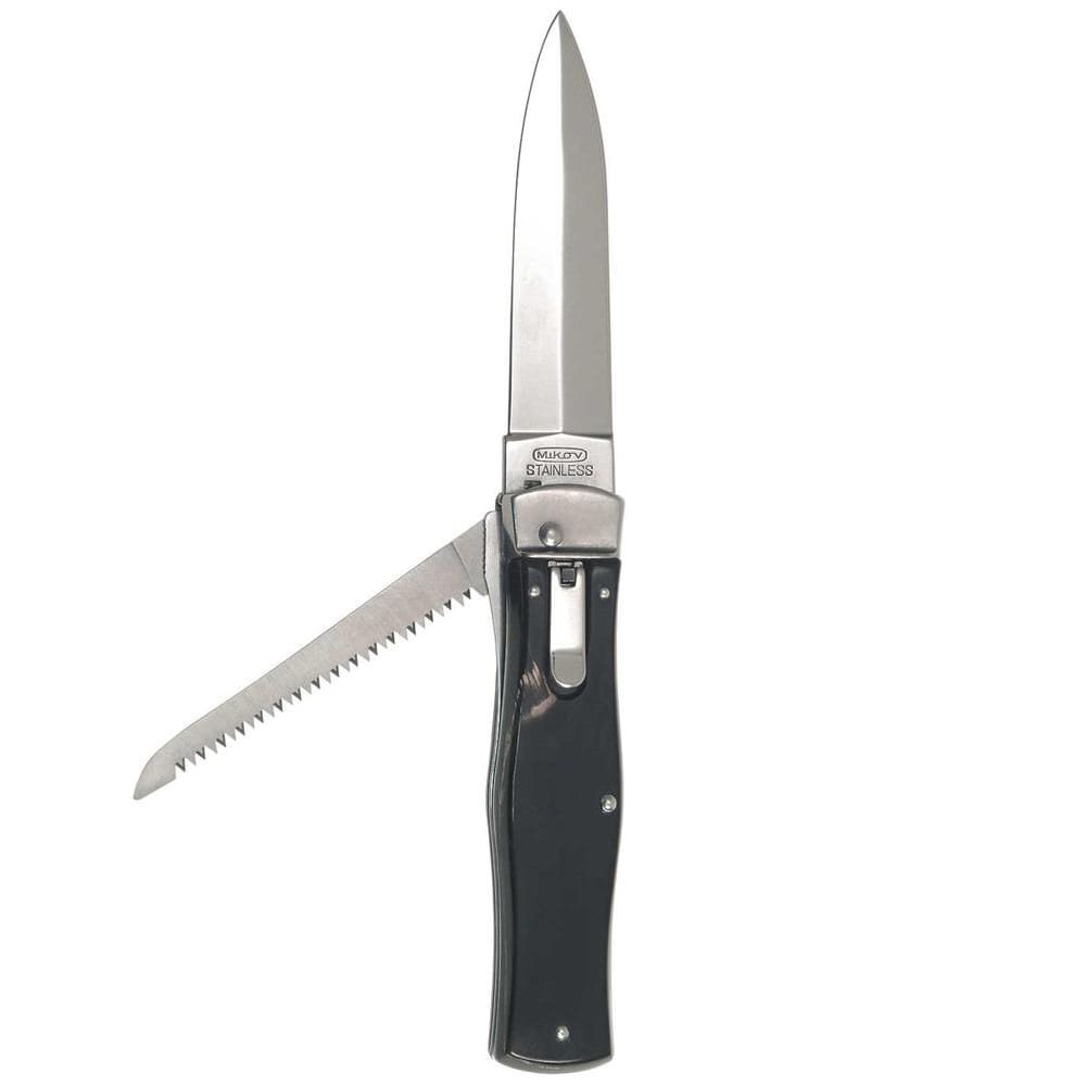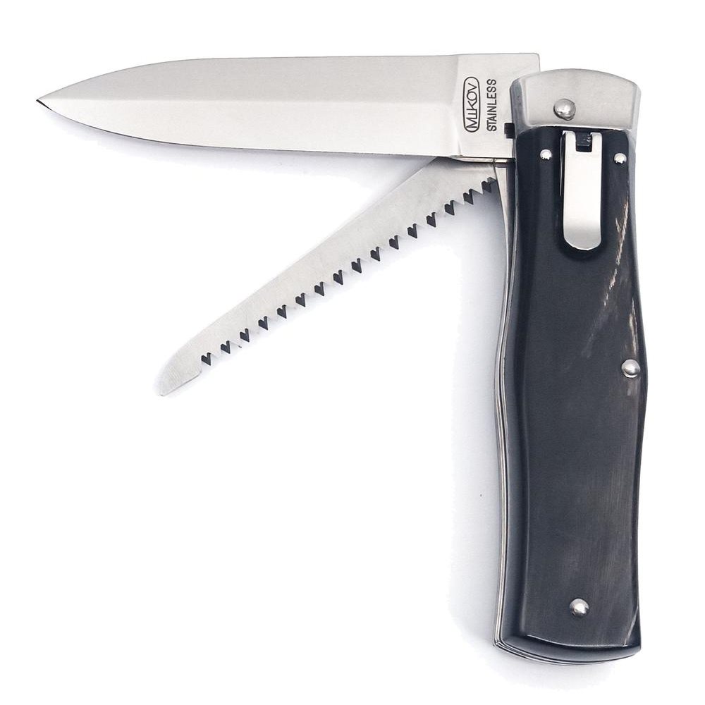 Le couteau PREDATOR est un couteau automatique à ouverture automatique fabriqué par la société Mikov, située au cœur de la Suisse tchèque, dans la ville de Mikulášovice. L'un des nombreux avantages du couteau PREDATOR est qu'il peut être ouvert rapidement d'une seule main. La lame du couteau est fabriquée en acier inoxydable 420 de haute qualité avec une dureté de 52 à 55 HRc. Le manche du couteau est fabriqué en corne de buffle, dont la structure crée un motif original. Sa forme garantit non seulement une prise en main agréable et ferme, mais empêche également la main de glisser et de se blesser.
