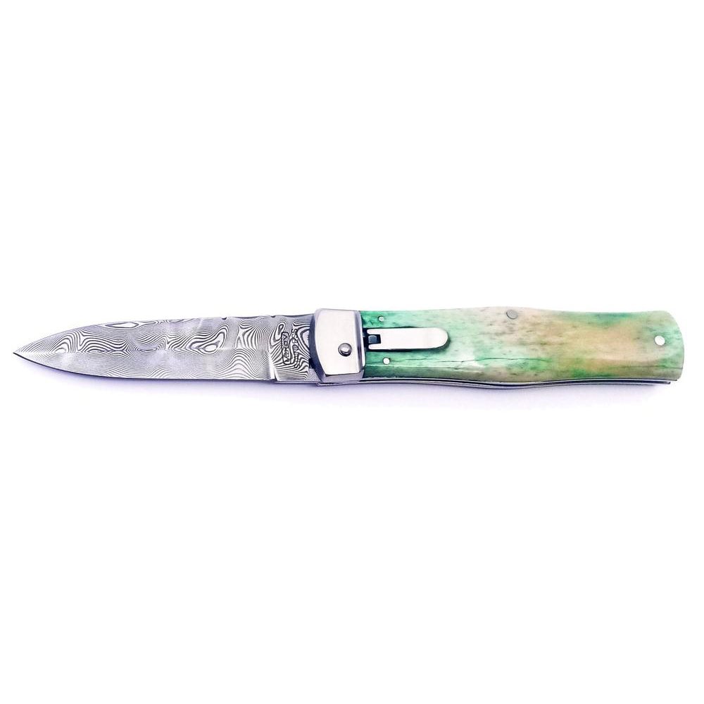 Matériau de la lame : PMC 27 - acier damassé. Matériau du manche : os. Longueur du produit : 120 mm. Longueur de la lame : 95 mm. Largeur de la lame : 23 mm. Poids du produit : 172 g. Étui : étui en cuir inclus. Plus d'informations