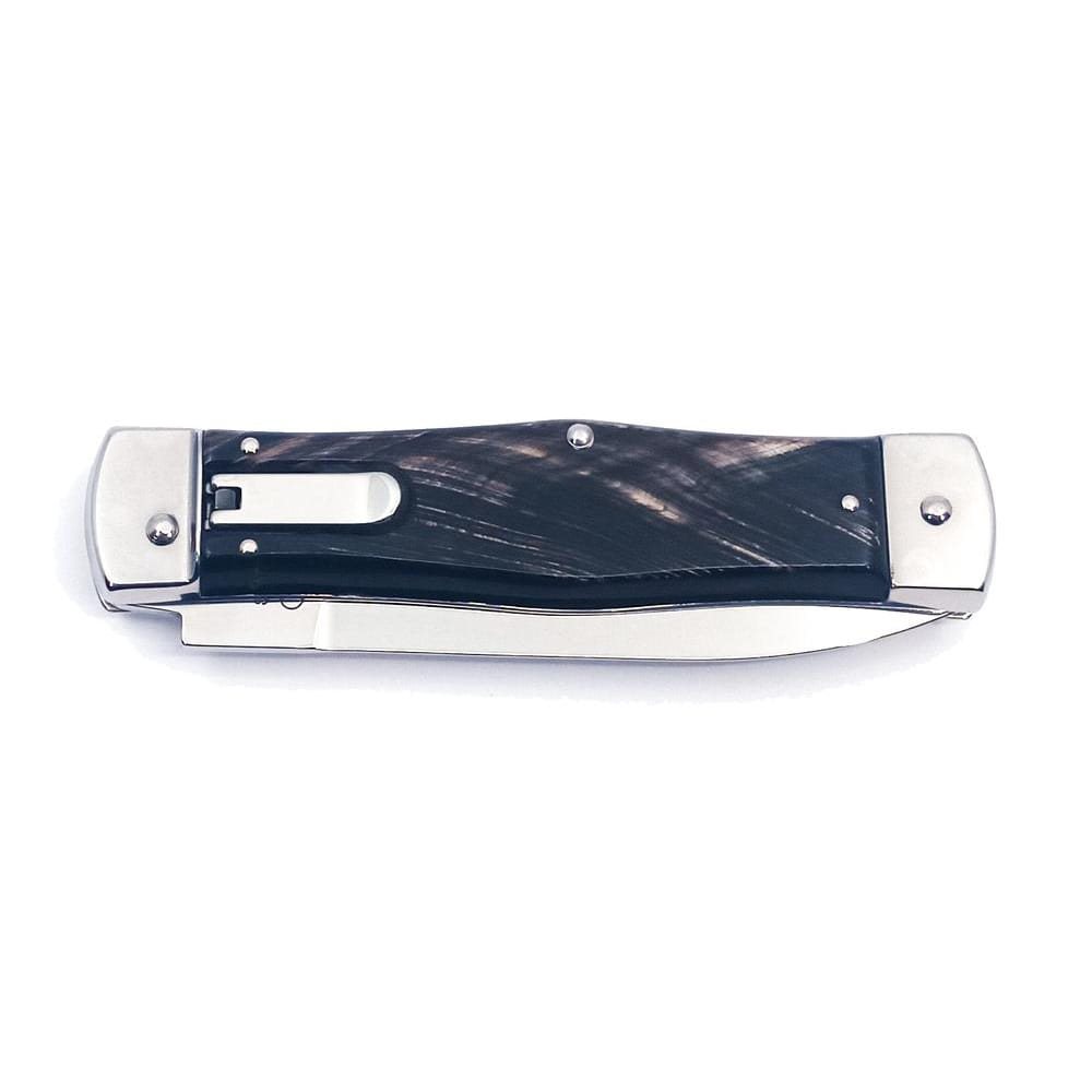 Le manche du couteau est fabriqué en corne de buffle, dont la structure crée un motif original. Sa forme garantit non seulement une prise en main agréable et ferme, mais empêche également la main de glisser et de se blesser. Le couteau est équipé d'une ferrure arrière qui souligne son design luxueux et intéressant. La ferrure peut être utilisée comme petit marteau, par exemple pour briser une vitre.