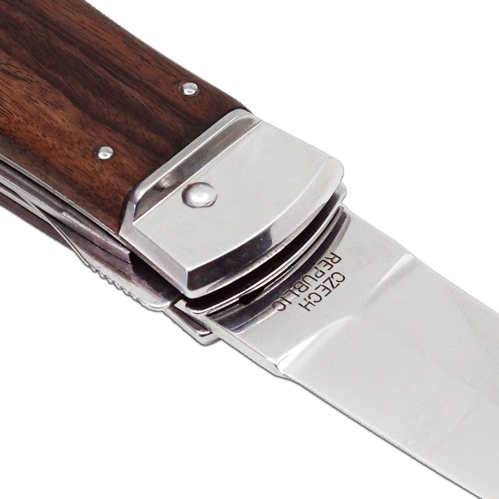 Le couteau PREDATOR est un couteau automatique à ouverture automatique fabriqué par la société Mikov, située au cœur de la Suisse tchèque, dans la ville de Mikulášovice. L'un des nombreux avantages du couteau PREDATOR est qu'il peut être ouvert rapidement d'une seule main. La lame du couteau est fabriquée en acier inoxydable 420 de haute qualité avec une dureté de 52 à 55 HRC. Le manche du couteau est fabriqué en bois exotique de haute qualité PALISANDER SANTOS. Sa forme garantit non seulement une prise en main agréable et ferme, mais empêche également la main de glisser et de se blesser.