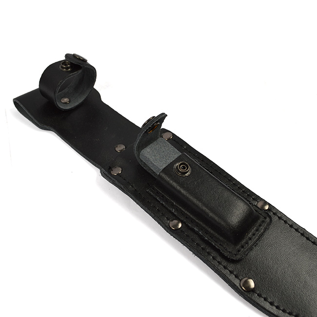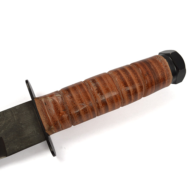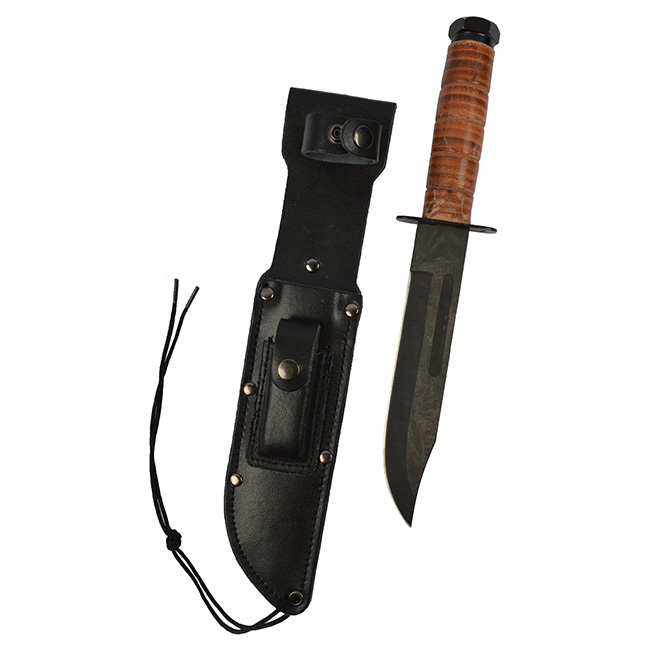 Couteau de combat américain. Conçu d'après le modèle du couteau de combat G.I. MARINE CORPS. Lame lisse. Lame noire et résistante avec rainure d'écoulement pour le sang. Manche en cuir. Étui en cuir noir avec pochette. Sangle pour la cuisse. Plus d'informations