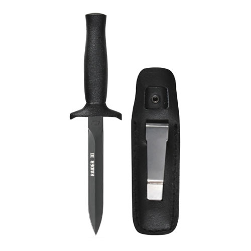 Petit poignard Raider III avec lame noire mate, livré avec un étui à clip qui peut être glissé, par exemple, dans une chaussure. Plus d'informations
