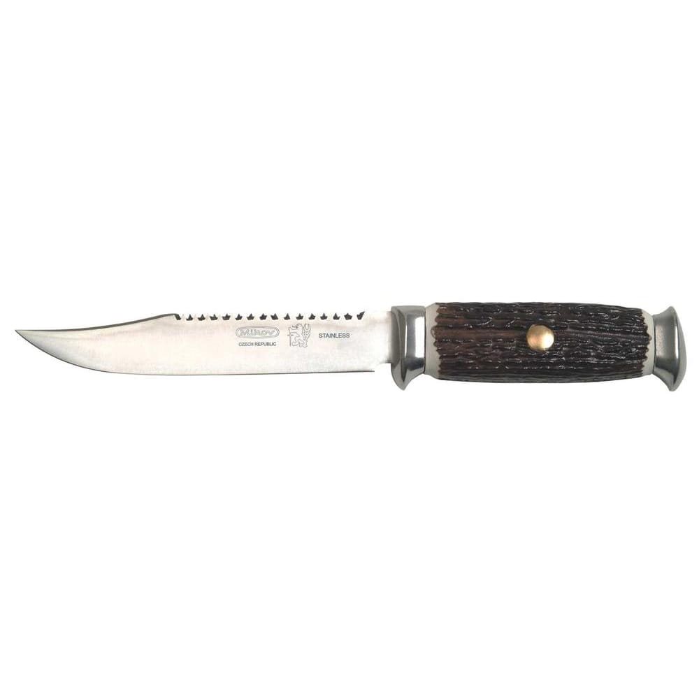La lame du couteau VENADO est fabriquée en acier inoxydable de haute qualité de type 425 avec une dureté de 52-55 HRc et a la forme d'un couteau à découper. Le dos de la lame du poignard est muni d'une scie dentée qui sert à couper les os ou le bois. Le manche de ce poignard de chasse est une imitation très réussie de bois de cerf. Le poignard est livré en standard avec un étui en cuir.