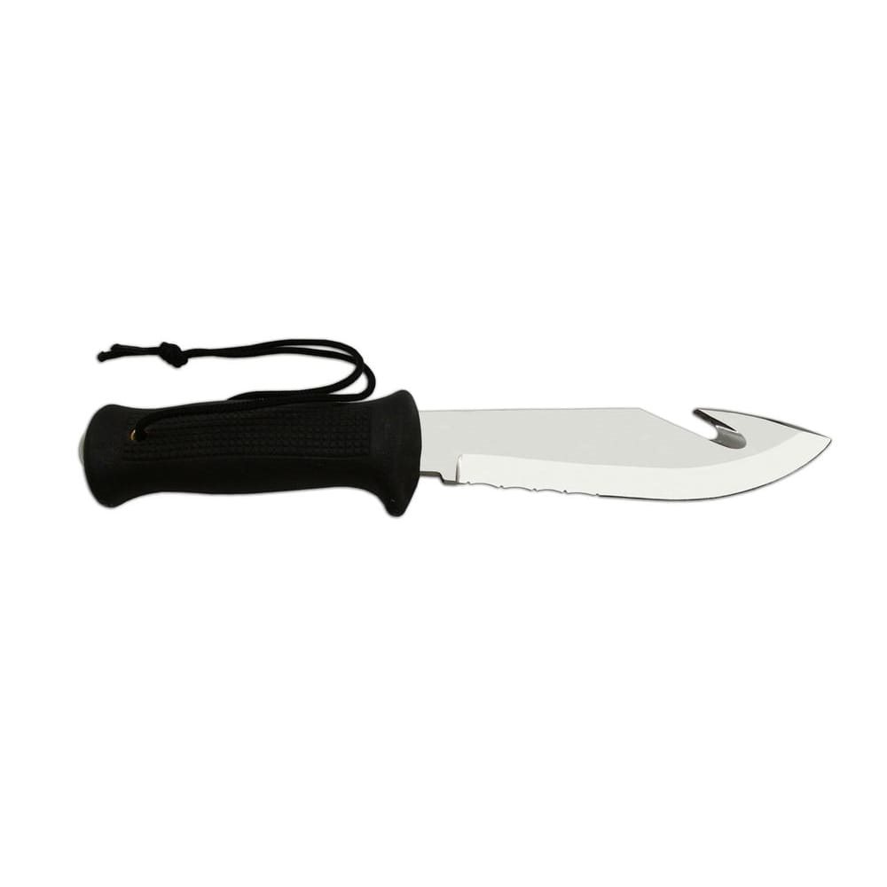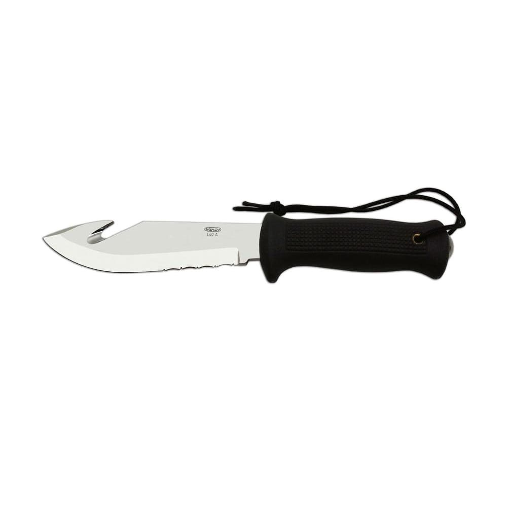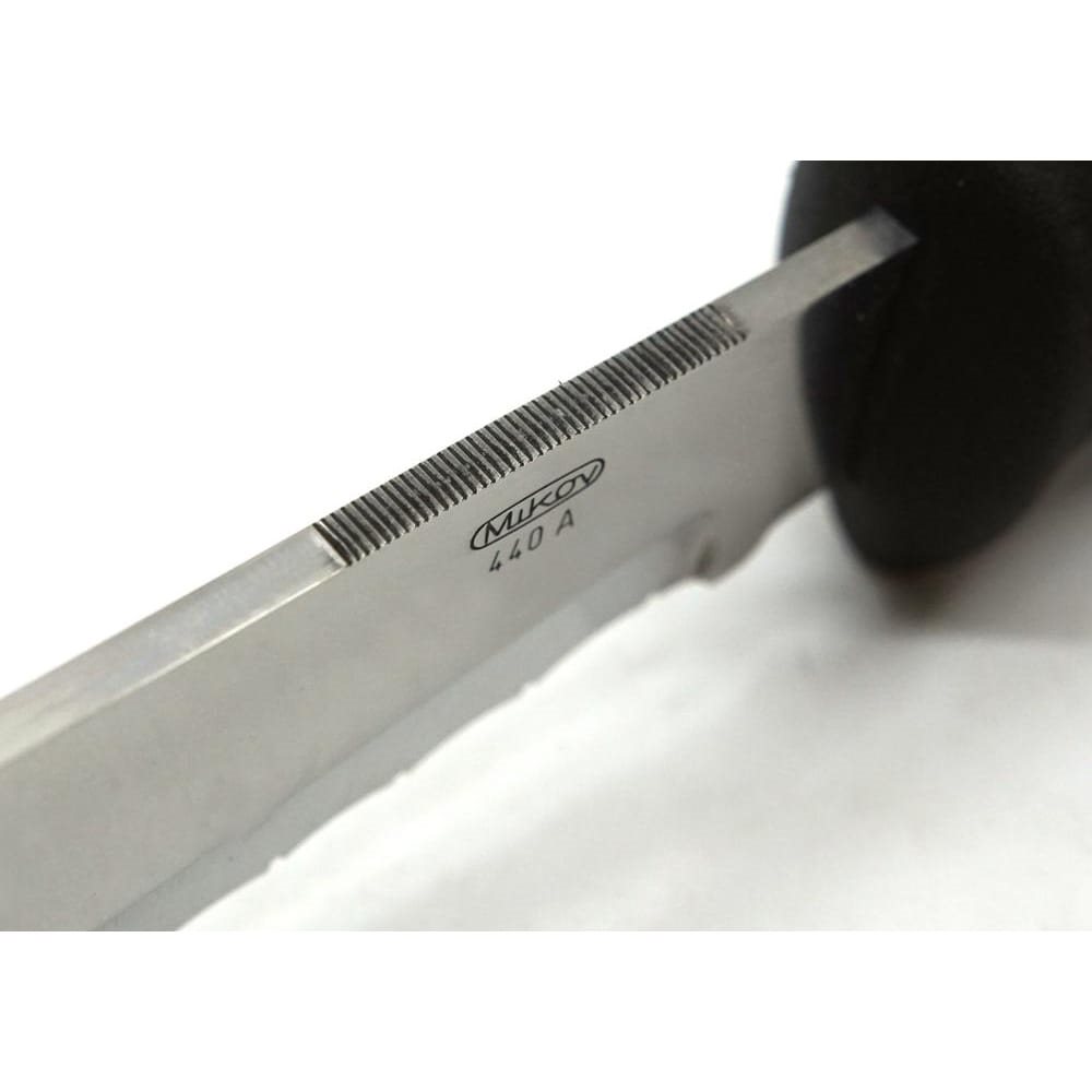 Couteau en acier inoxydable de la société tchèque Mikov, spécialement conçu pour les plongeurs. Le crochet arracheur sur la lame peut être utilisé sur les filets, les lignes de pêche, etc. La lame partiellement dentelée est adaptée à la coupe de cordes, tuyaux, caoutchouc, etc. Le marteau (brise-glace) situé à l'extrémité du manche peut être utilisé pour taper sur la bouteille d'un collègue, briser une vitre ou enfoncer un clou.