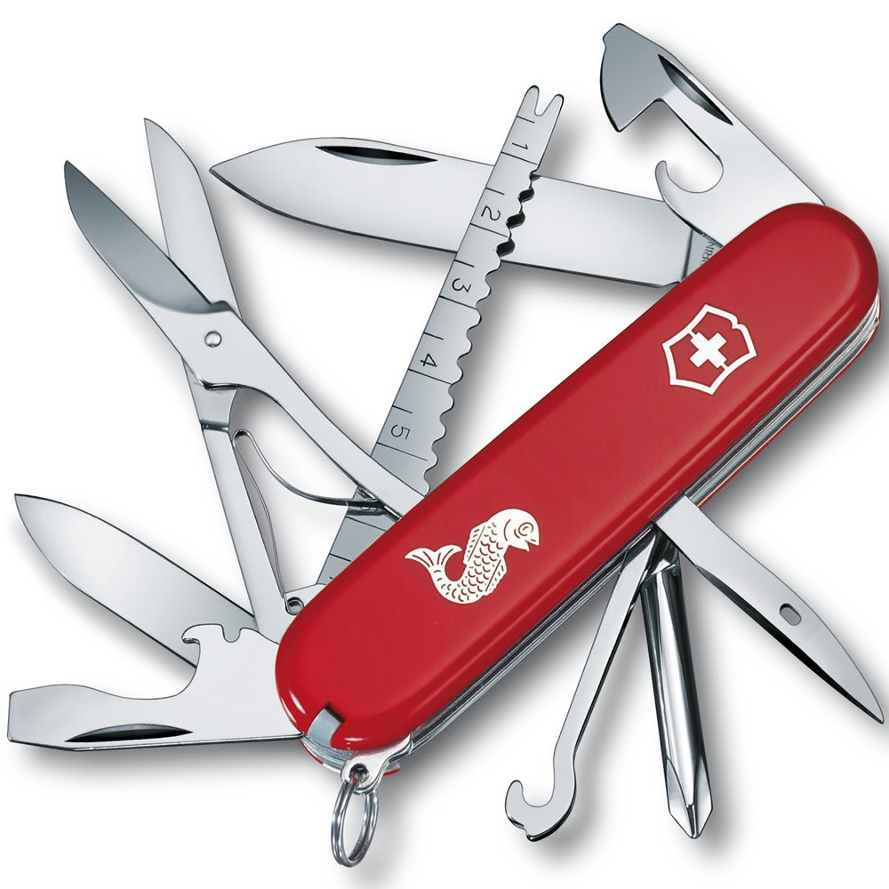 Couteau de poche de 91 mm, particulièrement adapté aux pêcheurs en raison de ses fonctions. Il comprend une règle pour mesurer les poissons avec un crochet. Nombre de fonctions : 17.