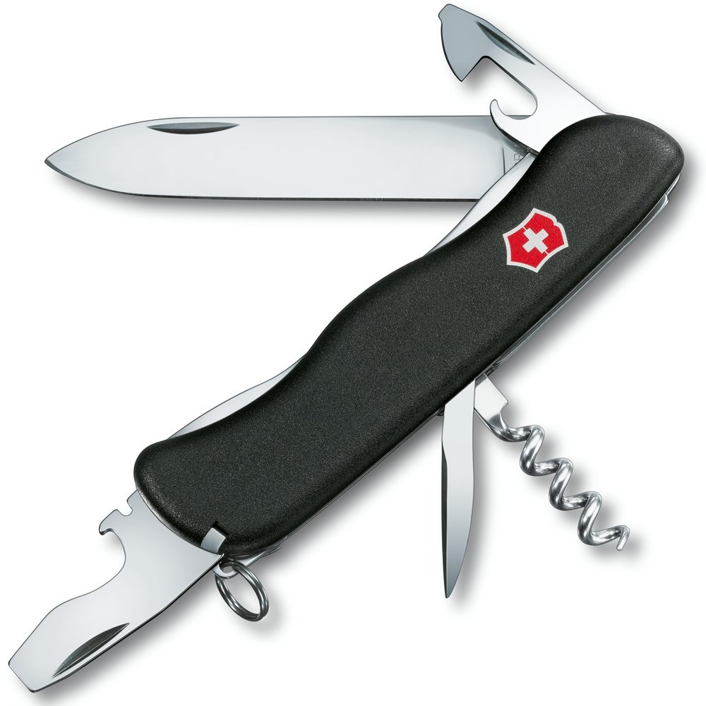 Ce couteau de poche avec cran de sécurité et manche noir dispose de 11 fonctions : lame fixe, tire-bouchon, ouvre-boîte, tournevis fin, décapsuleur, tournevis, dénudeur, poinçon et perforateur, anneau, pince à épiler, cure-dent. Plus d'informations