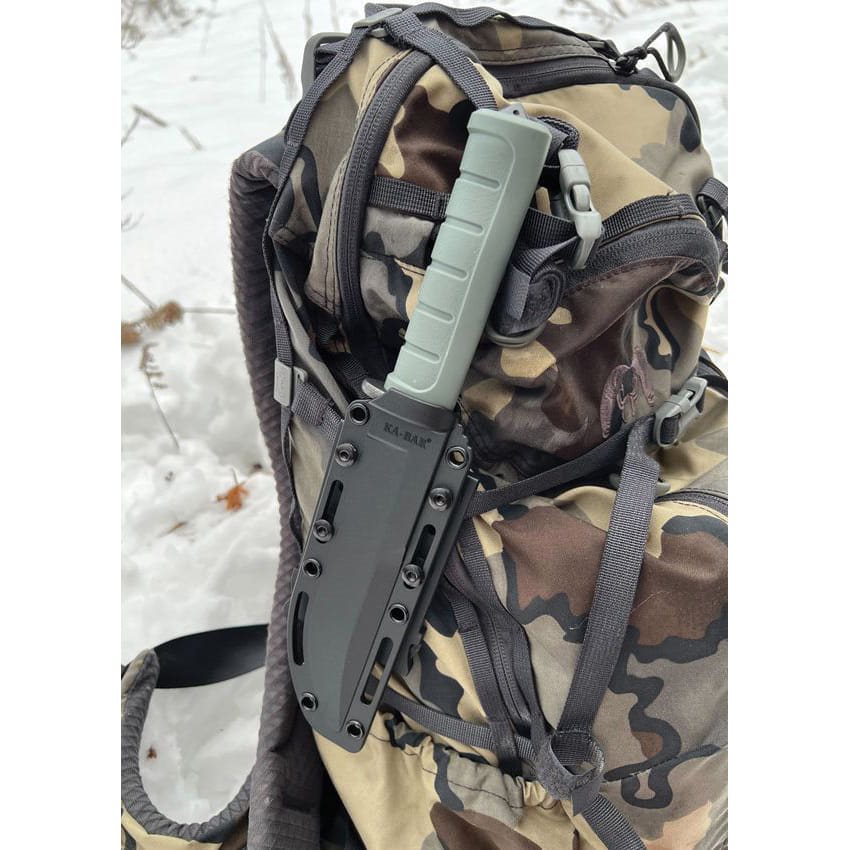 Couteau robuste à lame fixe conçu pour les utilisateurs exigeants. La lame à tranchant lisse est fabriquée en acier à outils D2 résistant avec un revêtement en poudre noirci améliorant la résistance mécanique. Le manche antidérapant est fabriqué en GFN, un nylon renforcé de fibre de verre. La partie avant du manche est équipée d'un pare-main, tandis que la partie arrière comporte une pointe pouvant être utilisée pour briser une vitre en toute sécurité ou pour l'autodéfense improvisée. Le couteau est livré avec un étui de ceinture compatible avec le système modulaire MOLLE/PALS. Le produit peut ainsi être facilement fixé à toute une gamme d'équipements tactiques compatibles, qu'il s'agisse de sacs à dos, de harnais de poitrine, de porte-plaques, etc.
