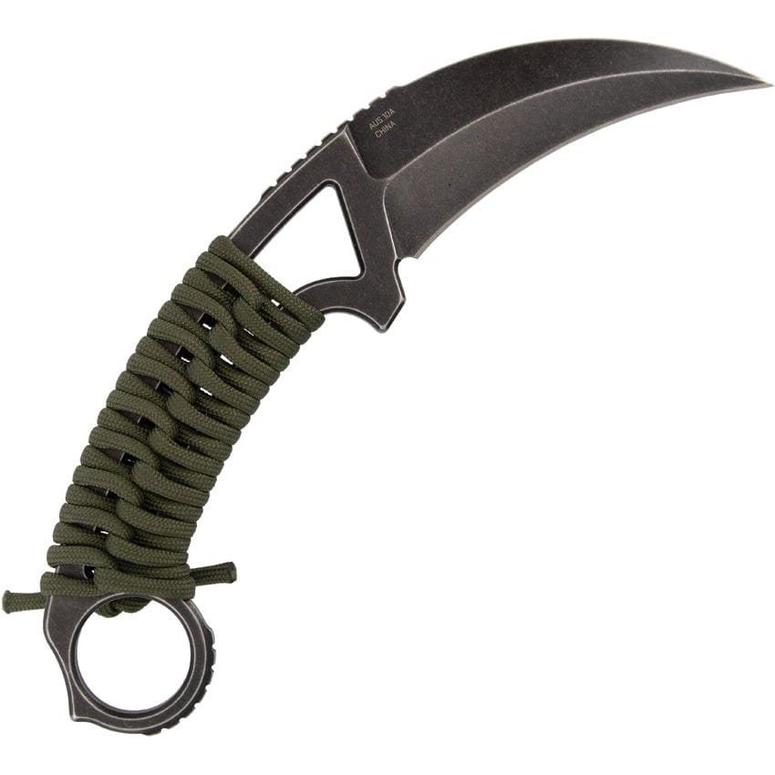Karambit exceptionnellement robuste, fabriqué en acier trempé CRYO avec finition stonewash. La lame incurvée typique du karambit, avec un tranchant lisse, est fabriquée en acier inoxydable CRYO AUS-10A de haute qualité, qui, combiné à un paracorde enroulé, forme également le manche du couteau. Le couteau est livré avec un étui en kydex solide avec un clip de ceinture Safe-Lock.