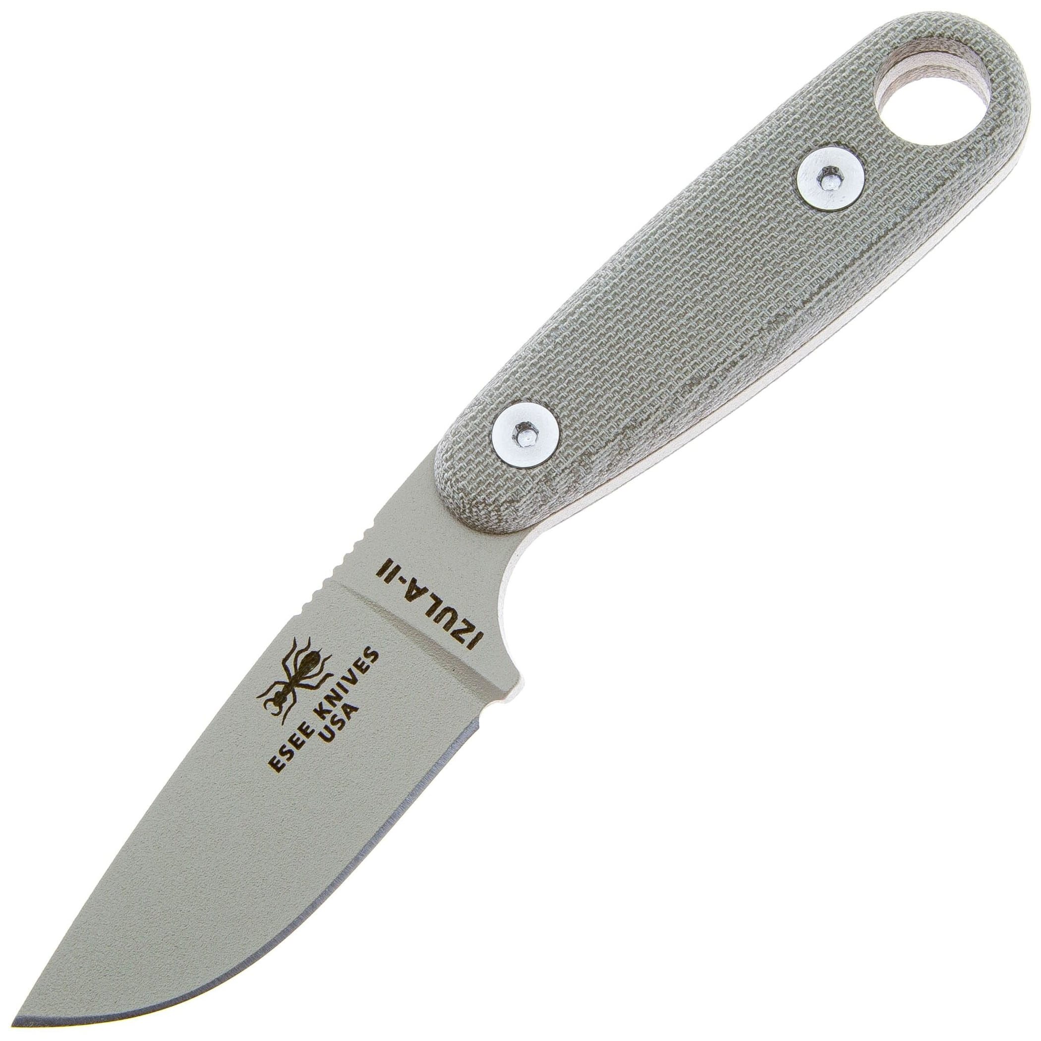 Un petit couteau pour les grandes tâches. Par rapport au premier modèle, l'Izula-II offre un manche plus long avec des plaquettes en Micarta de qualité supérieure. Grâce à sa construction full tang identique, il est toutefois possible de retirer les plaquettes et d'utiliser le couteau sans elles ou de tresser le manche avec une cordelette. La lame en acier au carbone 1095 d'une dureté de 55-57 HRC présente un affûtage plat et est protégée contre la corrosion et les reflets indésirables par un revêtement en poudre mat. Le couteau est livré avec un étui en plastique à fermeture automatique et un clip de ceinture amovible. Le couteau peut ainsi être porté horizontalement ou verticalement, tourné vers la droite ou vers la gauche. Grâce à plusieurs trous dans l'étui, il est également possible de l'accrocher à l'équipement à l'aide d'un mousqueton ou de passer une cordelette pour le porter autour du cou.