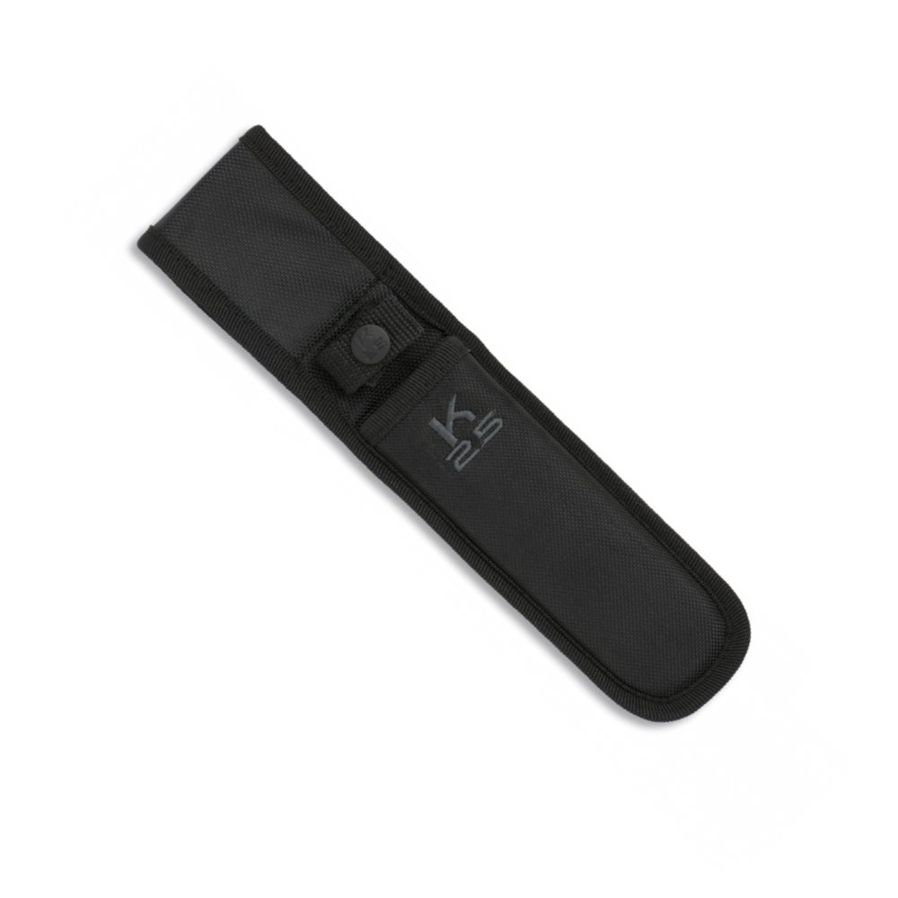L'emballage comprend un étui noir dans lequel le couteau est maintenu à l'aide d'une bande velcro. La construction full tang