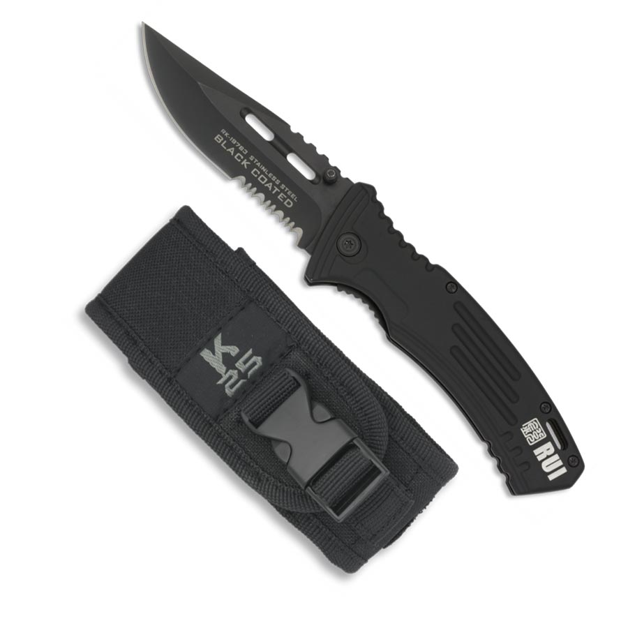 Couteau pliant de couleur noire de la marque espagnole K25. La lame est recouverte d'une couche de titane pour améliorer ses propriétés et le tranchant est combiné. Le manche est en aluminium et recouvert de caoutchouc pour une prise en main optimale. Le couteau est livré avec un étui en nylon de couleur noire.
