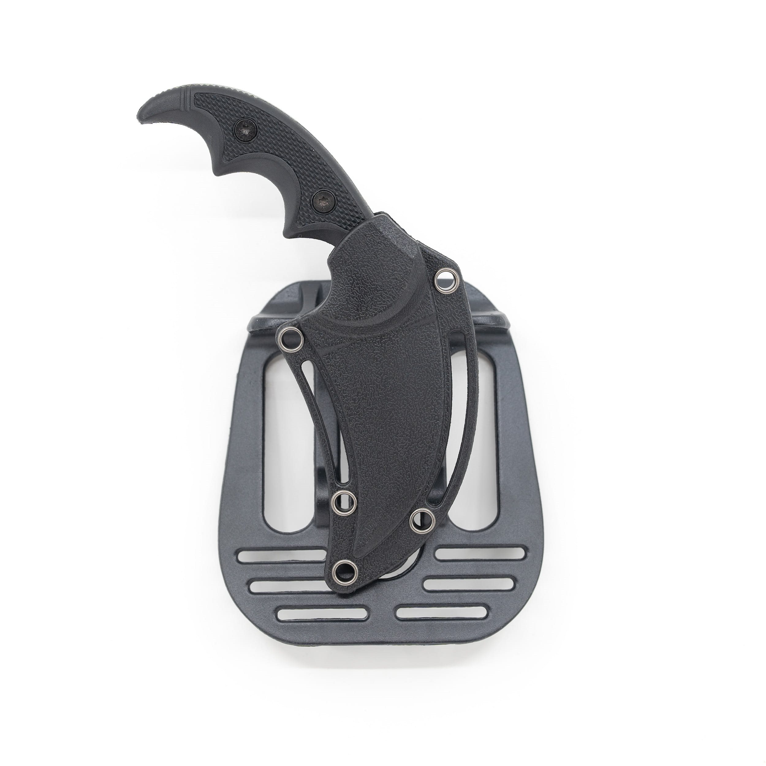 Karambit avec lame fixe et manche ergonomique. Le tranchant du couteau est dentelé sur toute sa longueur, et la surface de la lame présente un motif de camouflage numérique.