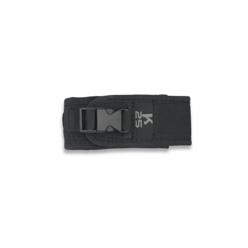 L'emballage comprend un étui en nylon camouflé qui se ferme à l'aide d'une bande Velcro et est également sécurisé par une boucle en plastique. L'étui est compatible MOLLE/PALS et peut également être fixé à la ceinture.