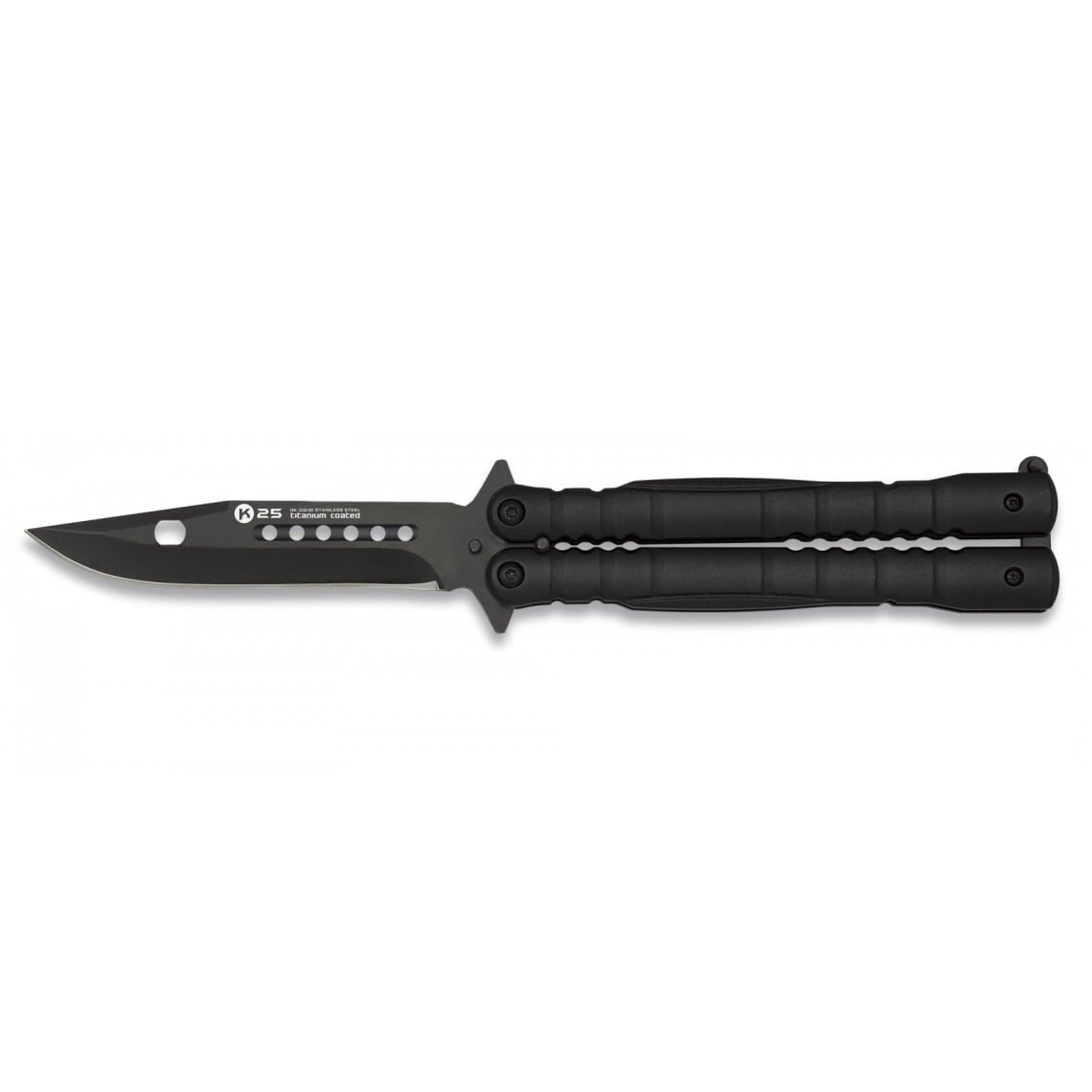 Couteau pliant de type papillon de la marque K25. La lame à tranchant lisse est fabriquée en acier inoxydable. Le manche en aluminium est muni d'un loquet de fixation à son extrémité. Le couteau est livré avec un étui en nylon camouflé qui se ferme à l'aide d'une bande Velcro et est également muni d'une boucle en plastique. L'étui est doté d'une poche pour le téléphone portable.
