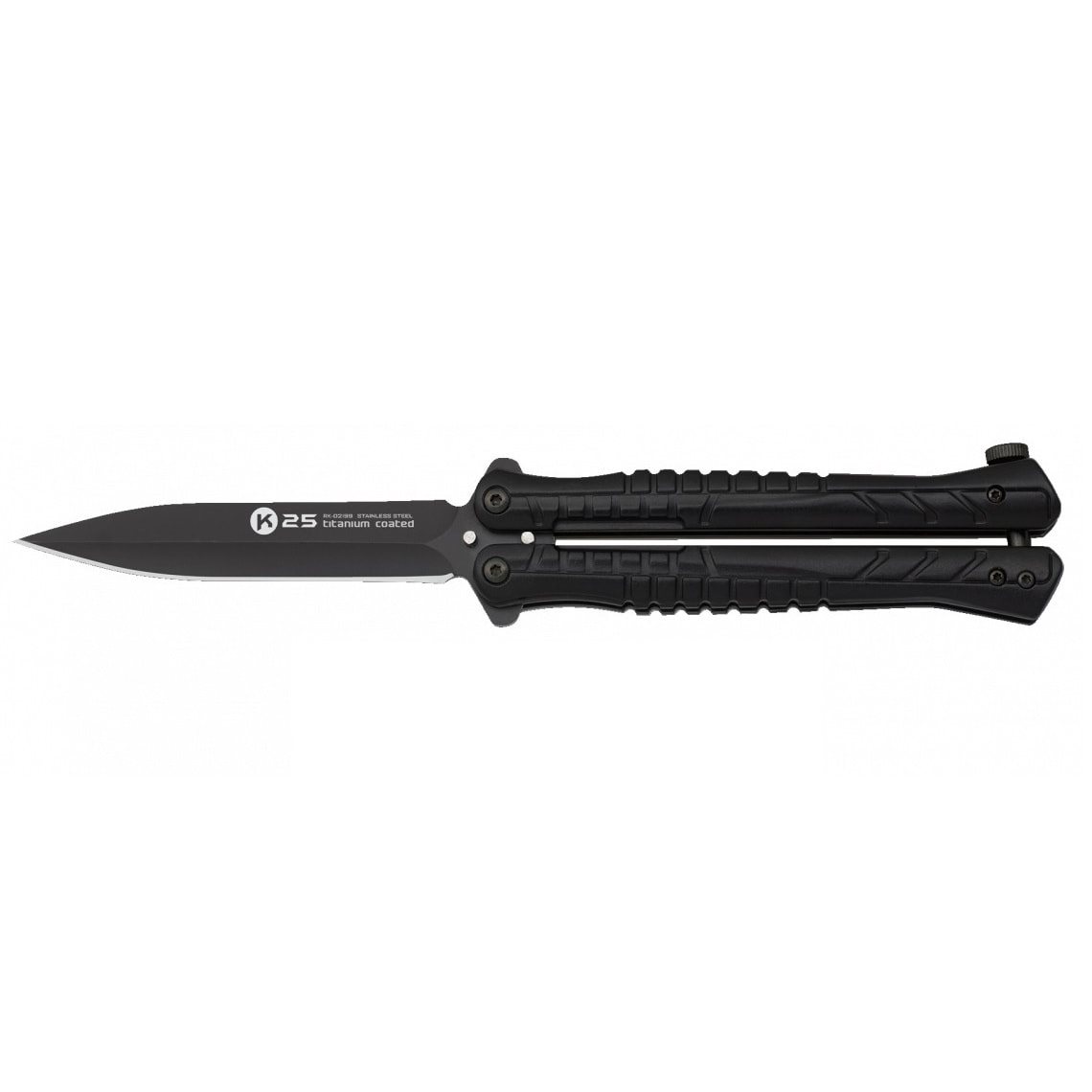 Couteau papillon/balisong robuste du fabricant Albainox. La lame du couteau à tranchant lisse est fabriquée en acier inoxydable 7Cr17Mov avec un revêtement en titane gris améliorant la résistance à la corrosion. Le manche noir est fabriqué en aluminium léger mais résistant et comporte à l'arrière un dispositif de sécurité garantissant une utilisation en toute sécurité.