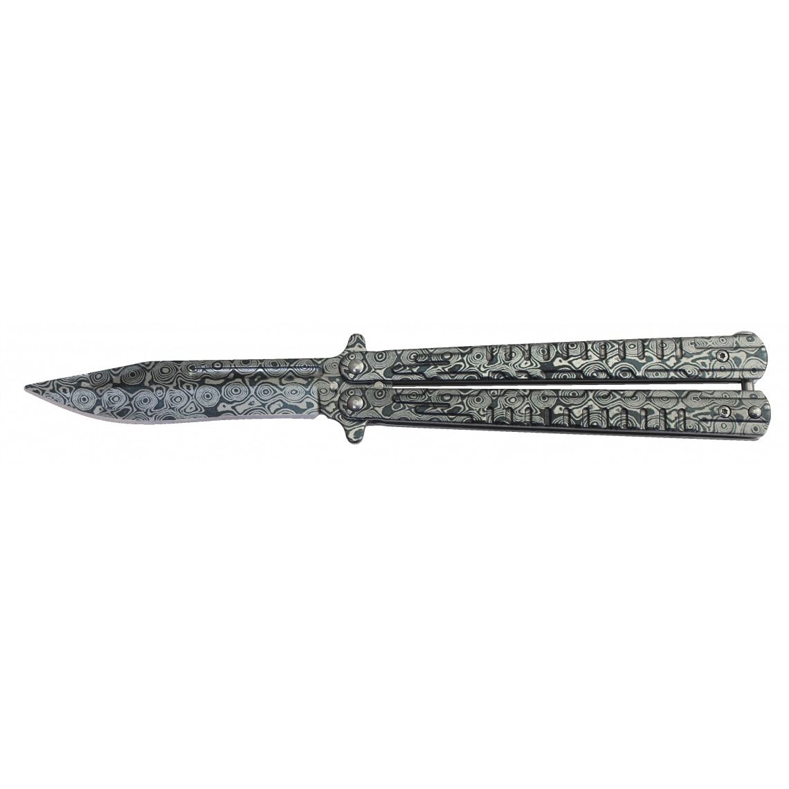 Couteau papillon élégant de la marque Albainox. La lame du couteau à tranchant lisse est fabriquée en acier inoxydable 3Cr13Mov et, tout comme le manche, elle est recouverte d'un motif bleu rappelant le damas. Plus d'informations