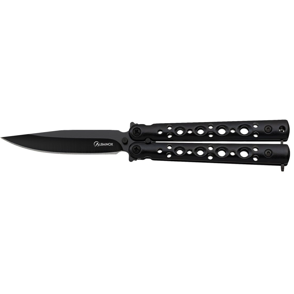 Couteau pliant de type papillon avec lame lisse en acier inoxydable 3Cr13Mov. La lame est noircie et porte le logo du fabricant ALBAINOX. Le manche est en acier noirci.