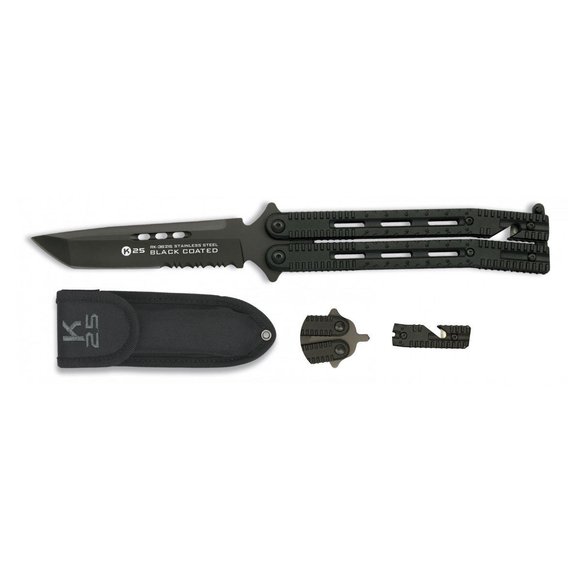 Couteau pliant en métal, dit « papillon », avec lame tanto et surface en titane gris. Pour l'ouvrir (ou le fermer), il suffit de rabattre le manche en deux parties et de le verrouiller à l'aide du cran situé à l'extrémité du manche. Le manche comporte des et des rainures dans le manche pour éviter que le couteau ne glisse de la main. Lorsqu'il est fermé, il y a une pointe pour briser le verre à l'extrémité du manche et un coupe-sangle de l'autre côté. Un étui en nylon est inclus dans l'emballage.