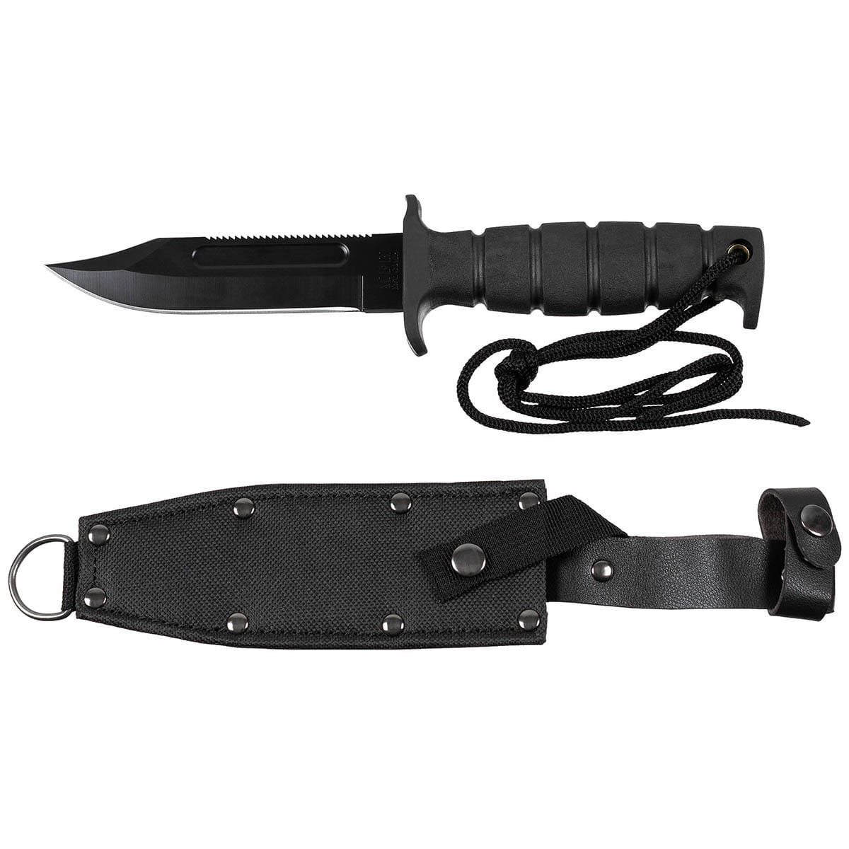 Réplique de qualité du couteau de pilote américain. Lame noircie. Tranchant supérieur en forme de scie. Manche en plastique dur. Étui en cuir avec sangle en nylon et lacet. Plus d'informations