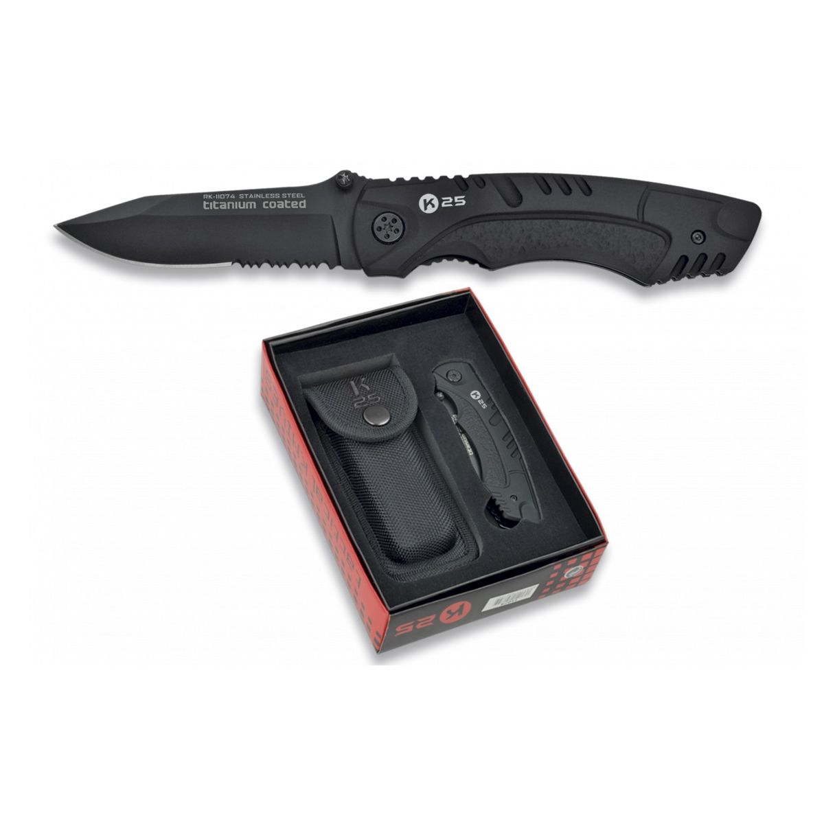 Couteau de poche agréable 11074 du fabricant espagnol K25. Grâce à son manche caoutchouté en SFL (Rubber Coated), le couteau tient parfaitement dans la main et offre une bonne prise en main. Ouverture à l'aide d'un bouton dans la lame et sécurité LinerLock. Livré avec un étui en nylon moulé.