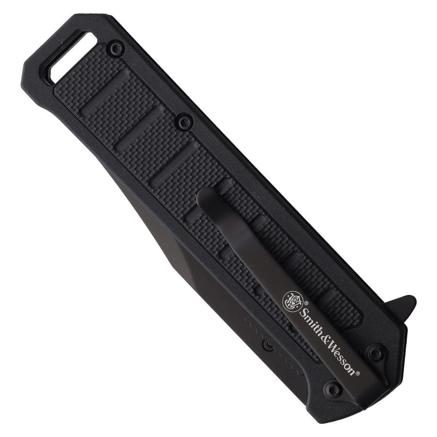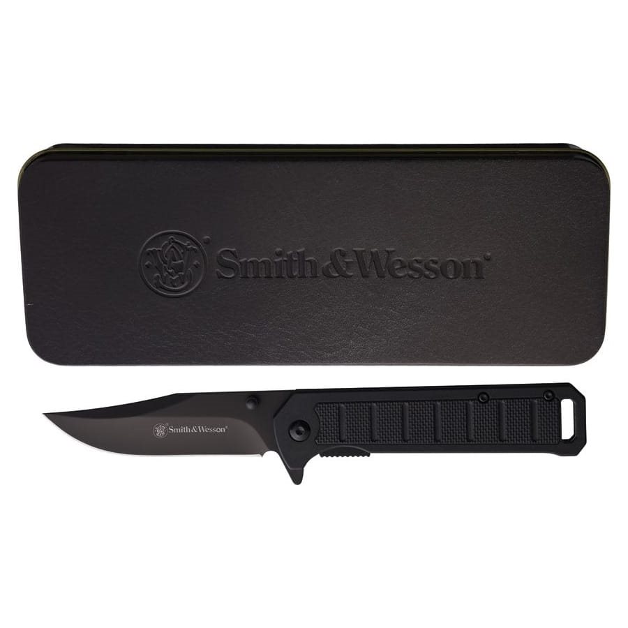 Couteau pliant simple à ouverture assistée, livré dans un coffret cadeau avec le logo du fabricant Smith & Wesson. La lame Clip point noircie à tranchant lisse est fabriquée en acier inoxydable et dispose d'une goupille double face et d'un flipper pour une ouverture facile d'une seule main. La sécurité est assurée par un verrouillage Linerlock fiable. Le manche s'élargit légèrement vers l'extrémité et ses plaquettes sont en nylon résistant avec une poignée antidérapante. L'extrémité du manche est munie d'un trou pour passer un cordon de sécurité et dispose d'un clip de poche en métal.