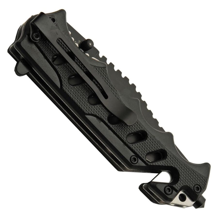 Couteau pliant entièrement noir avec ouverture assistée et plusieurs éléments inspirés des couteaux de sauvetage. Plus d'informations