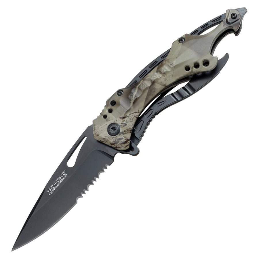 La lame du couteau comporte un trou qui permet de l'ouvrir d'une seule main. Le flipper, une protubérance qui dépasse du dos du manche lorsque le couteau est fermé, facilite également l'ouverture d'une seule main. Il suffit de l'appuyer avec le doigt (généralement l'index) pour que le couteau s'ouvre. qui, lorsque le couteau est fermé, dépasse du dos du manche. Il suffit de l'appuyer avec le doigt (généralement l'index) pour ouvrir le couteau. En position ouverte, le couteau est sécurisé par un verrou LinerLock. Le manche est équipé d'un clip de poche en métal, d'un décapsuleur et d'un brise-vitre à son extrémité.