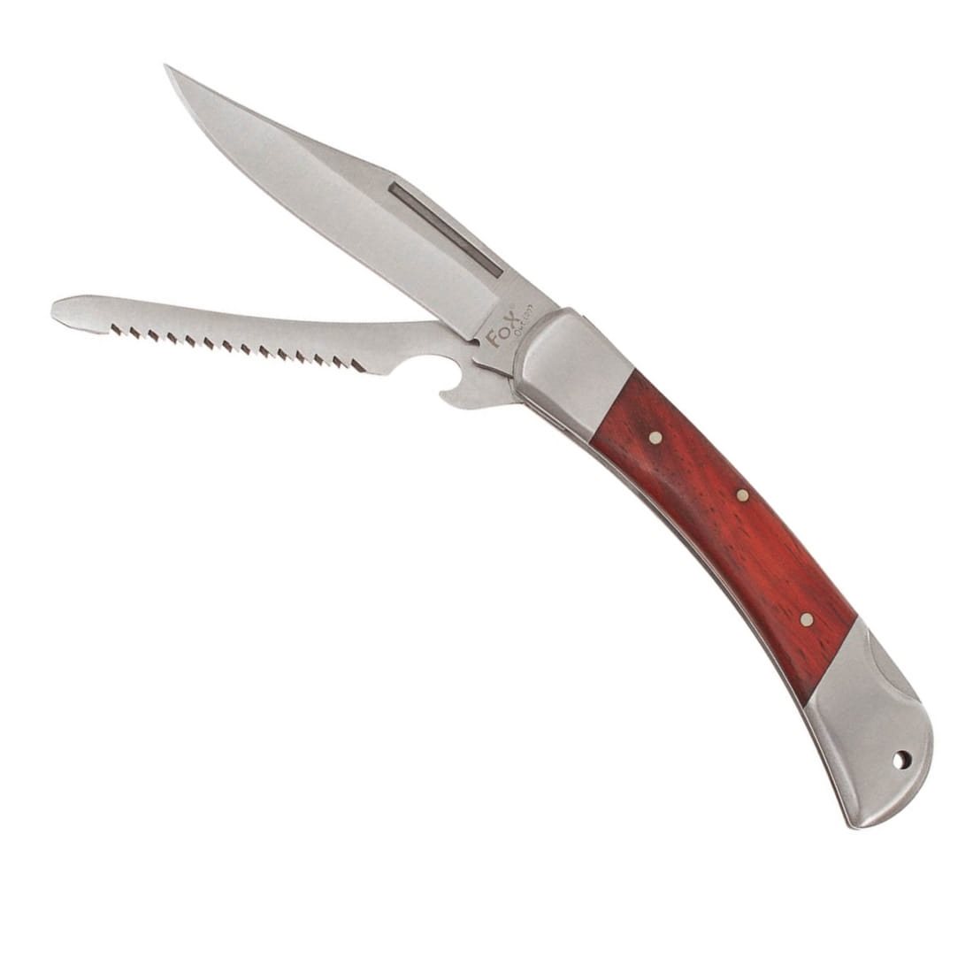 Couteau de chasse avec scie et décapsuleur.