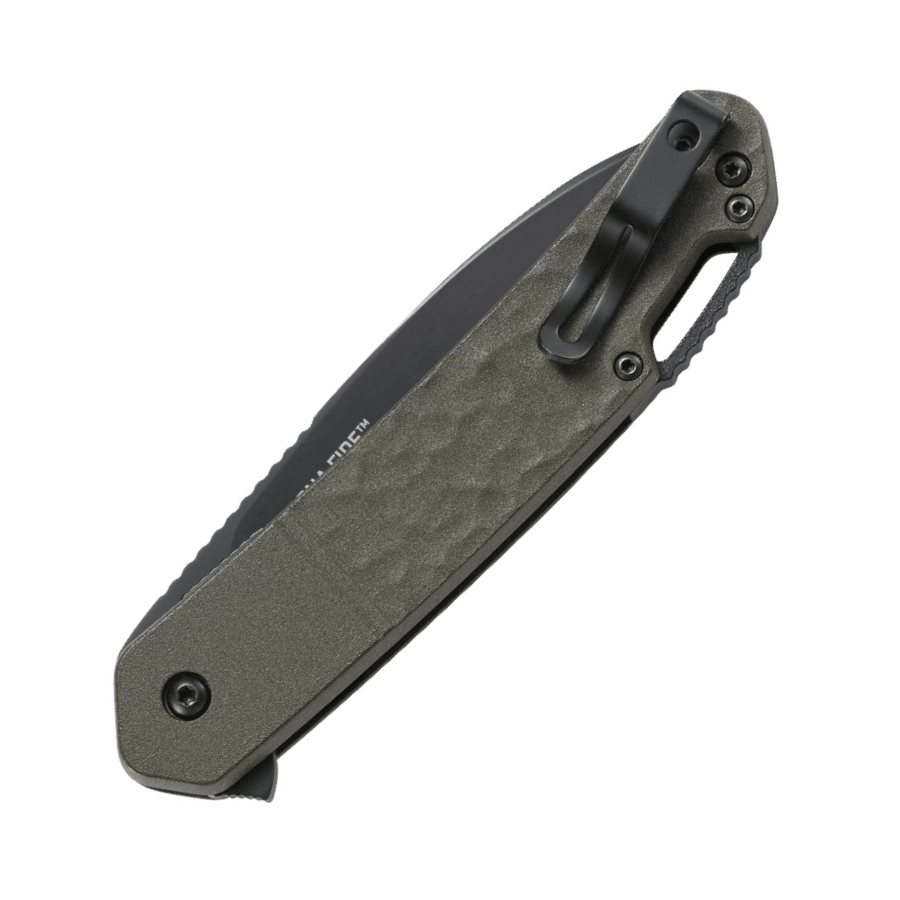 Le manche est en aluminium, ce qui lui confère une grande résistance tout en restant léger. Le manche est légèrement rugueux avec une surface métallique mate de couleur olive. À l'arrière du manche se trouve un œillet permettant d'y passer une lanière. un cordon, tandis qu'un clip de poche métallique est fixé à l'arrière à l'aide d'une vis. Le manche est également équipé d'un verrouillage LinerLock fiable qui maintient le couteau en position ouverte en toute sécurité. La lame est en acier inoxydable 440C et mesure 10,5 cm de long.