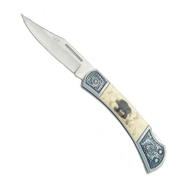 Couteau de chasse pliant avec ornements métalliques sur les côtés du manche et motif de chasse. Longueur totale : 19 cm. Longueur de la lame : 8,5 cm. Plus d'informations