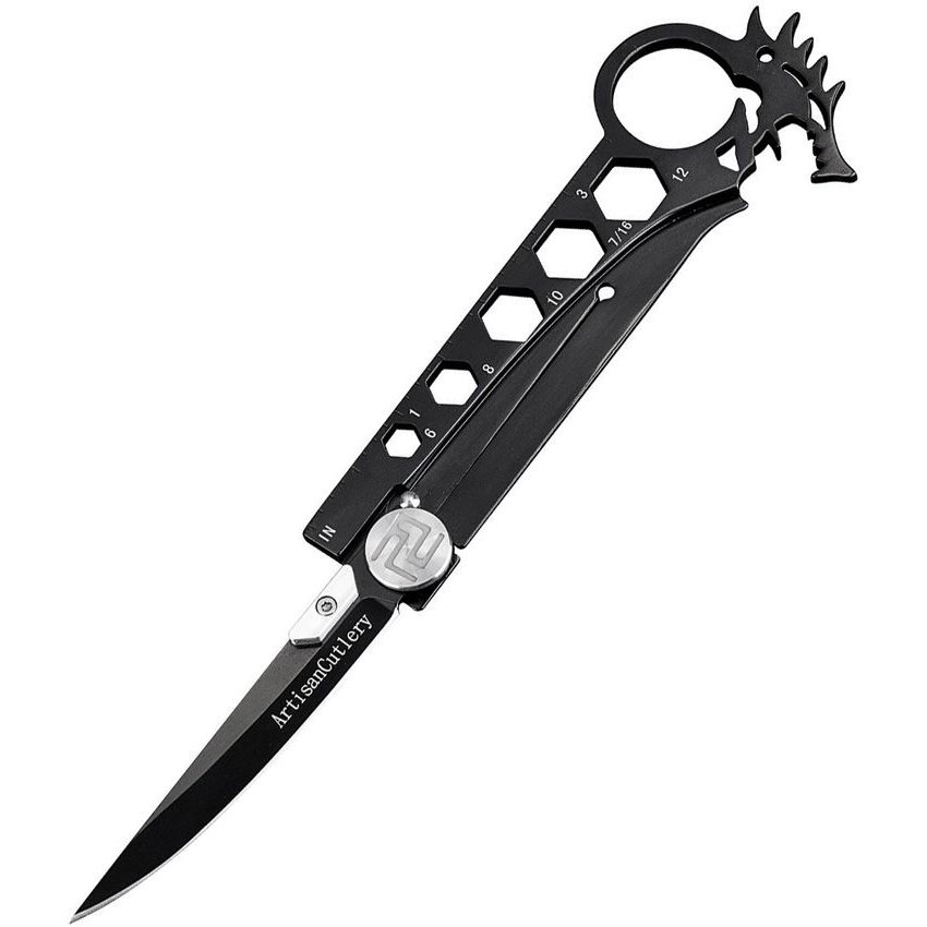 Couteau multifonctionnel élégant équipé de clés hexagonales intégrées dans le manche et d'une règle intégrée. La lame du couteau est fine, dispose d'un tranchant lisse et est fabriquée en acier inoxydable AUS-8. Une fois ouverte, elle est sécurisée par un verrou FrameLock fiable, tandis qu'un roulement à billes en céramique assure une ouverture facile et agréable. Le manche est en acier et comporte à son extrémité un trou pour les doigts et un décapsuleur en forme de tête de dragon. Le couteau est livré avec un étui en kydex noir à fixer à la ceinture.