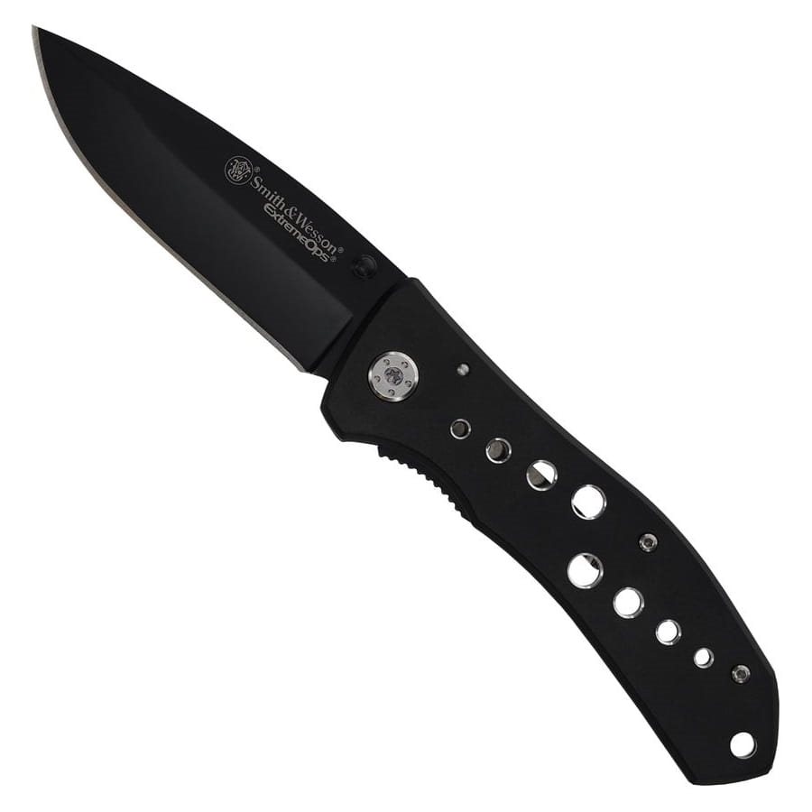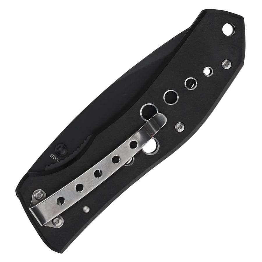 Couteau pliant EDC entièrement noir. La lame à tranchant lisse et de forme Drop point est fabriquée en acier inoxydable et est sécurisée à l'aide d'un verrou Linerlock lorsqu'elle est ouverte. Pour une ouverture facile d'une seule main, il est possible d'utiliser la goupille située dans la partie supérieure de la lame. Les plaquettes du manche présentent une texture antidérapante et sont fabriquées en aluminium. Le couteau est bien sûr équipé d'un clip de poche pour un transport facile et d'un trou pour passer un cordon de sécurité.