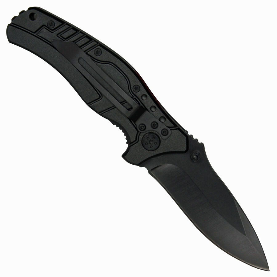Couteau pliant entièrement métallique avec clip pour fixation à la ceinture. S'ouvre d'une seule main.