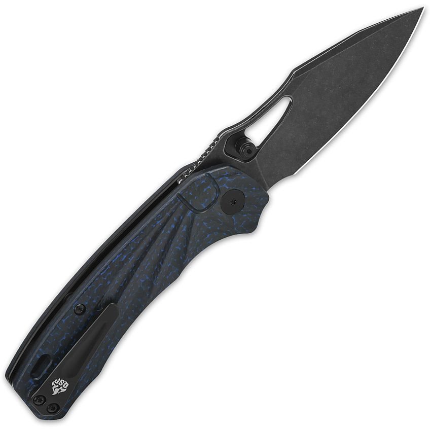 Le manche est légèrement anatomique afin de s'adapter parfaitement à la main dans toutes les situations. Ses plaquettes sont en fibre de carbone avec une texture antidérapante très fine. La fibre de carbone est un matériau idéal pour les plaquettes, notamment grâce à sa grande résistance mécanique et son poids très faible. À l'extrémité du manche, vous trouverez un trou pour passer un cordon de sécurité et, bien sûr, un clip de poche en métal.