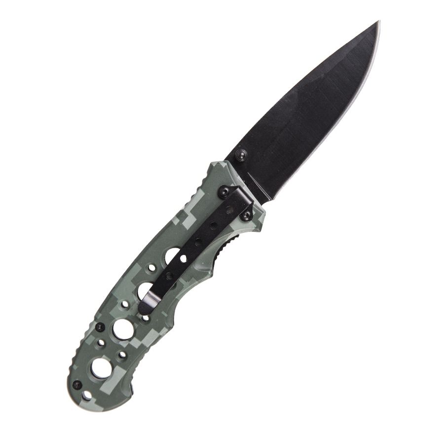 Couteau pliant de qualité de la marque Mil-Tec. Avec sécurité anti-fermeture. Lame noire. Manche en camouflage AT-digital. La lame est équipée d'un ergot permettant l'ouverture d'une seule main. Clip sur le manche pour fixation à la ceinture. Plus d'informations