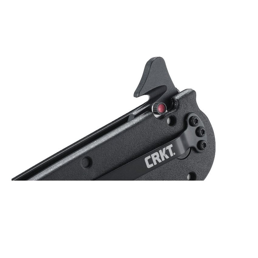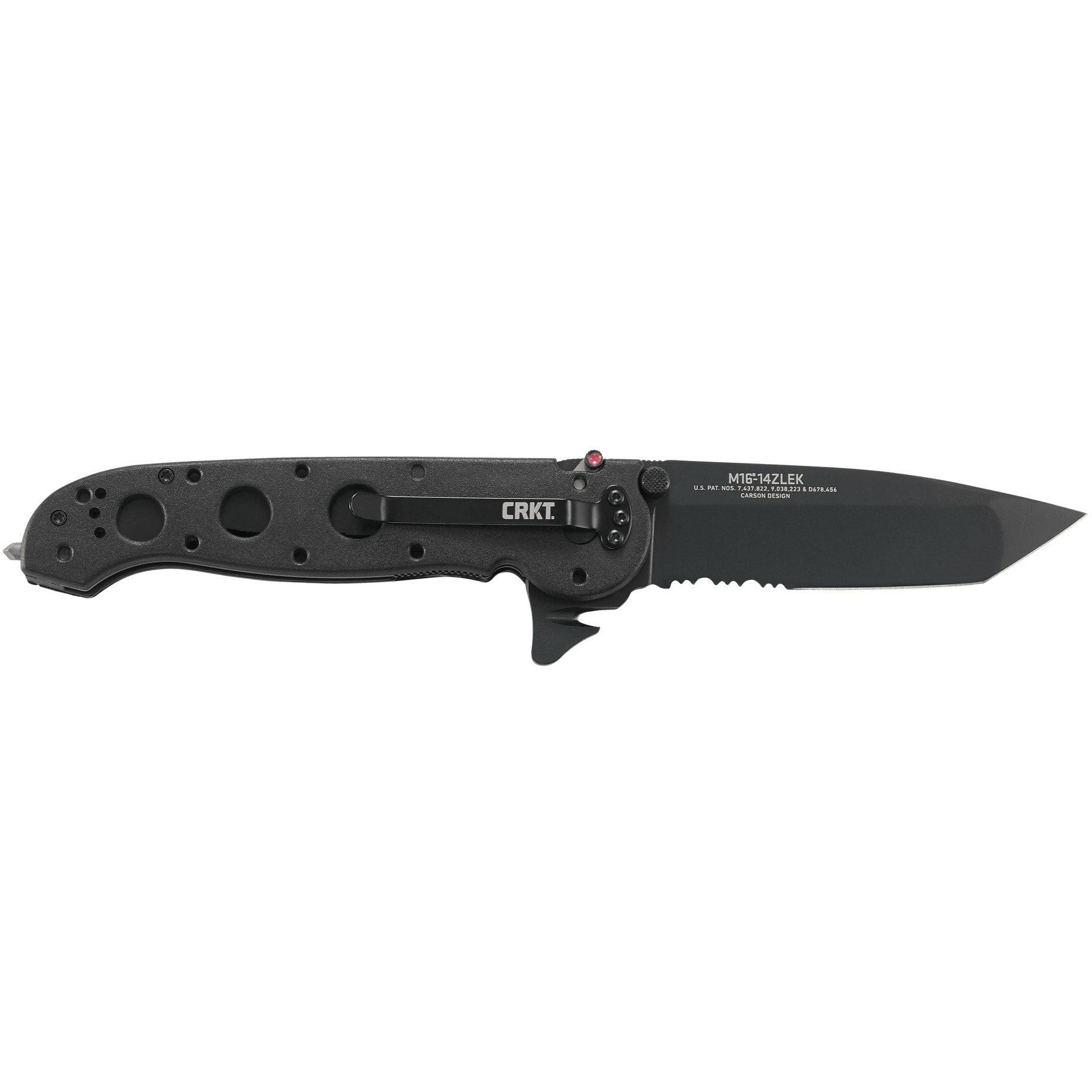 Ce couteau est conçu pour un usage professionnel. La lame en forme de tanto présente un tranchant partiellement dentelé et est équipée d'un goupille double face avec une surface rugueuse qui facilite l'ouverture du couteau d'une seule main. Étant double face, elle convient aussi bien aux droitiers qu'aux gauchers. La lame est également équipée d'un « flipper ». Celui-ci est assez proéminent dans ce cas, principalement parce qu'il comprend également un coupe-sangles/ceintures. Sinon, le flipper est destiné à ouvrir le couteau d'une seule main. Lorsque le couteau est fermé, il dépasse du dos du manche. Il suffit de l'appuyer avec le doigt, de faire un mouvement du poignet, et la lame sort et le couteau s'ouvre. La lame est fabriquée en acier inoxydable AUS 8 de haute qualité avec une surface noircie. Le manche est fabriqué en plastique très résistant avec des trous circulaires au milieu (on retrouve ce style sur pratiquement tous les couteaux de la série M16 de CRKT). Le manche est recouvert d'un revêtement antidérapant qui offre une bonne prise en main.