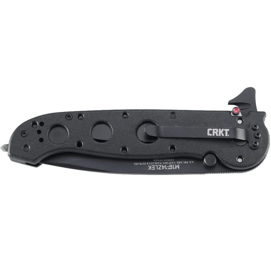 Le manche est fabriqué en plastique très résistant avec des trous circulaires au centre (ce style se retrouve sur pratiquement tous les couteaux de la série M16 de CRKT). À l'extrémité du manche se trouve un brise-vitre, et à l'arrière, un clip de poche en métal. Le couteau est verrouillé en position ouverte par un système LinerLock, qui est également complété par un curseur sur le dos du manche.