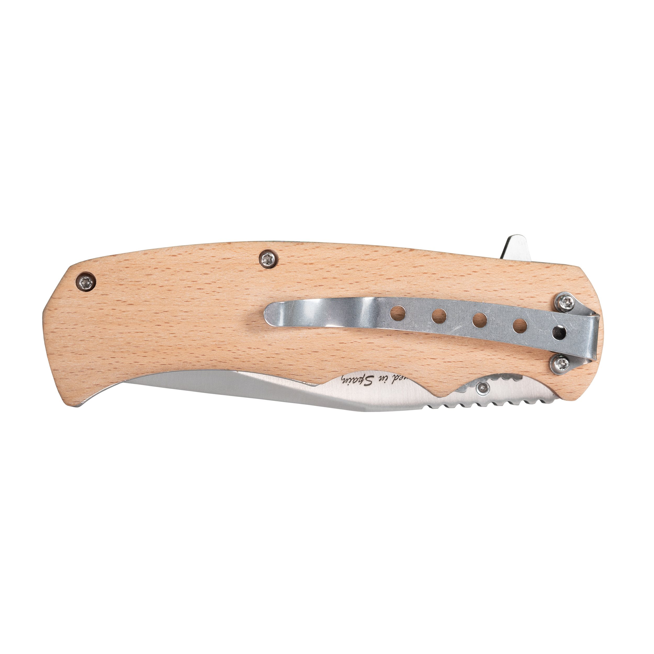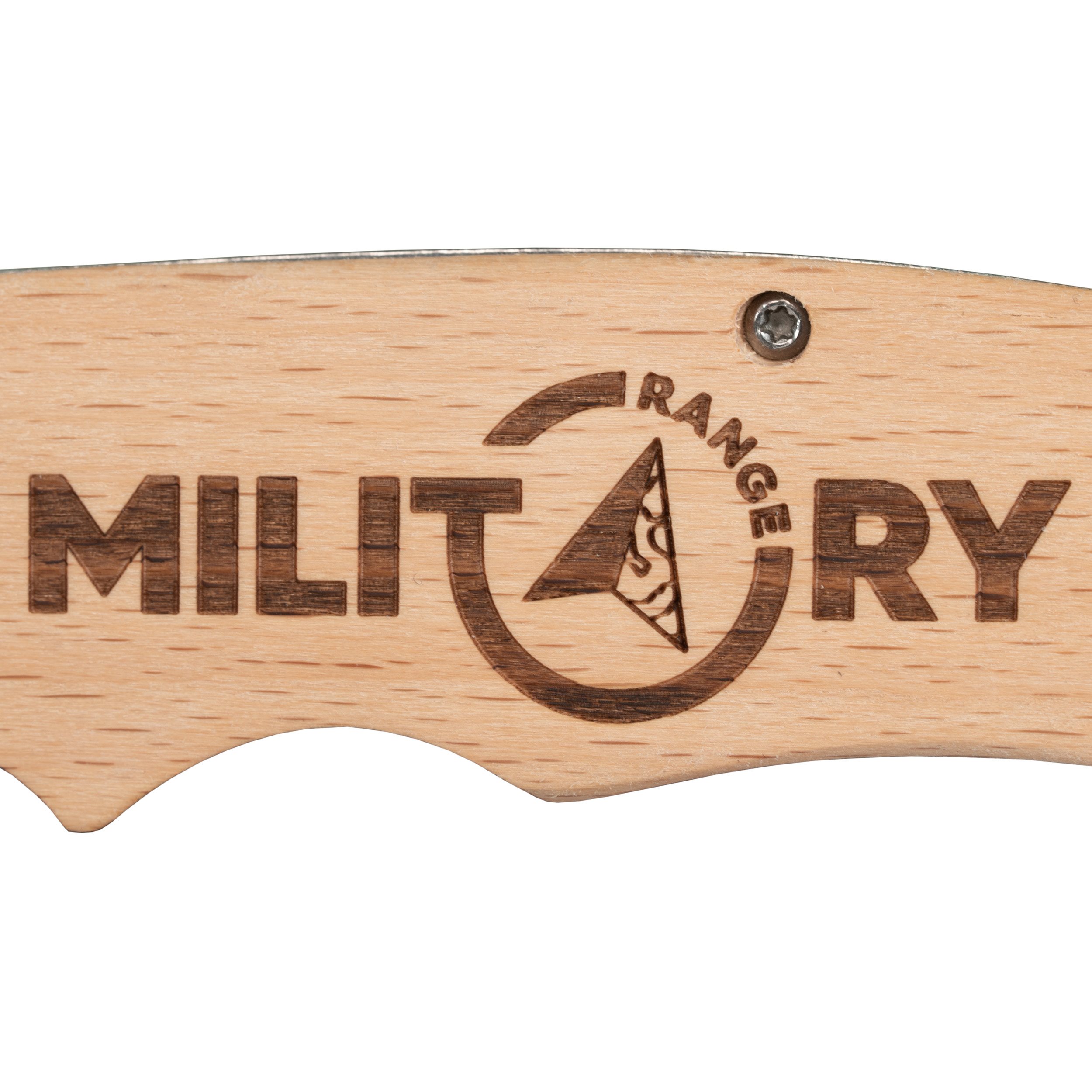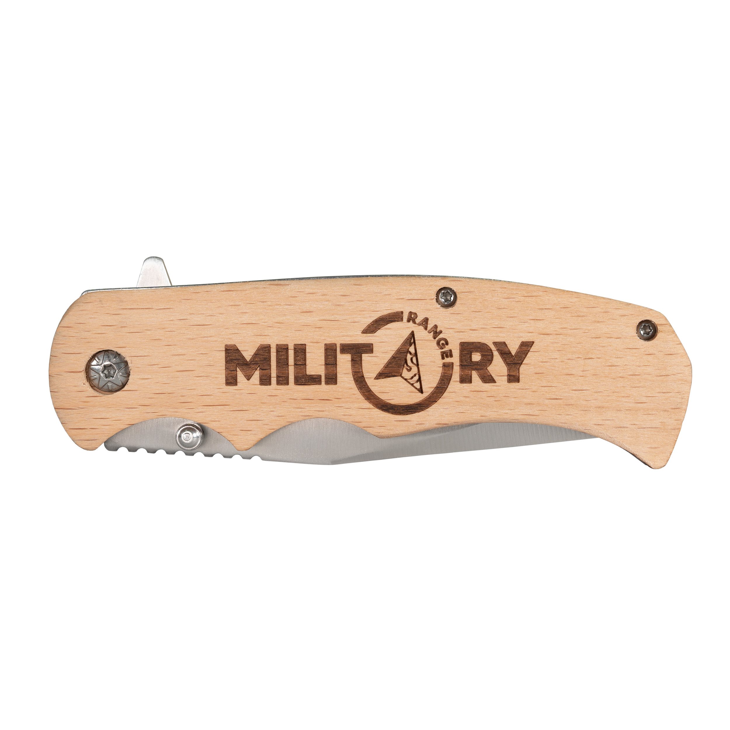 Couteau pliant à lame lisse, avec manche en bois naturel et gravure MILITARY RANGE. Taille pratique du couteau : suffisamment grand pour toutes les tâches courantes et suffisamment petit pour être facilement transporté. Couteau EDC idéal à un prix raisonnable. La lame argentée mate est équipée d'un ergot sur un côté pour permettre l'ouverture du couteau d'une seule main et d'un flipper qui sert au même effet. Il suffit de pousser le flipper vers l'avant pour ouvrir le couteau.