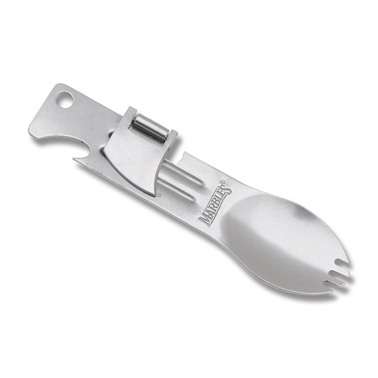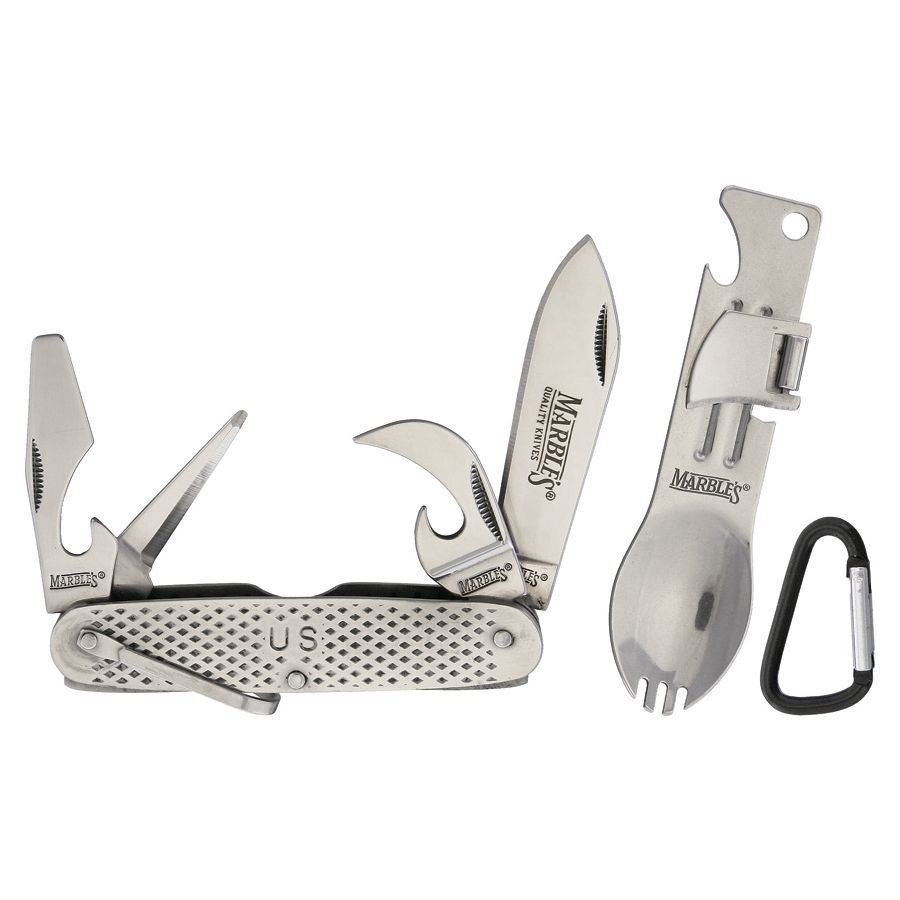 Couteau multifonction pliant avec petits couverts (cuillère et fourchette en un) et mousqueton inclus dans l'emballage. La longueur du couteau fermé est d'environ 92 mm, la longueur de la lame est de 65 mm. Matériau : acier inoxydable. Plus d'informations