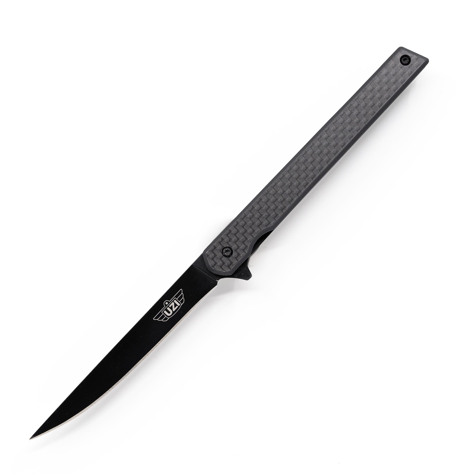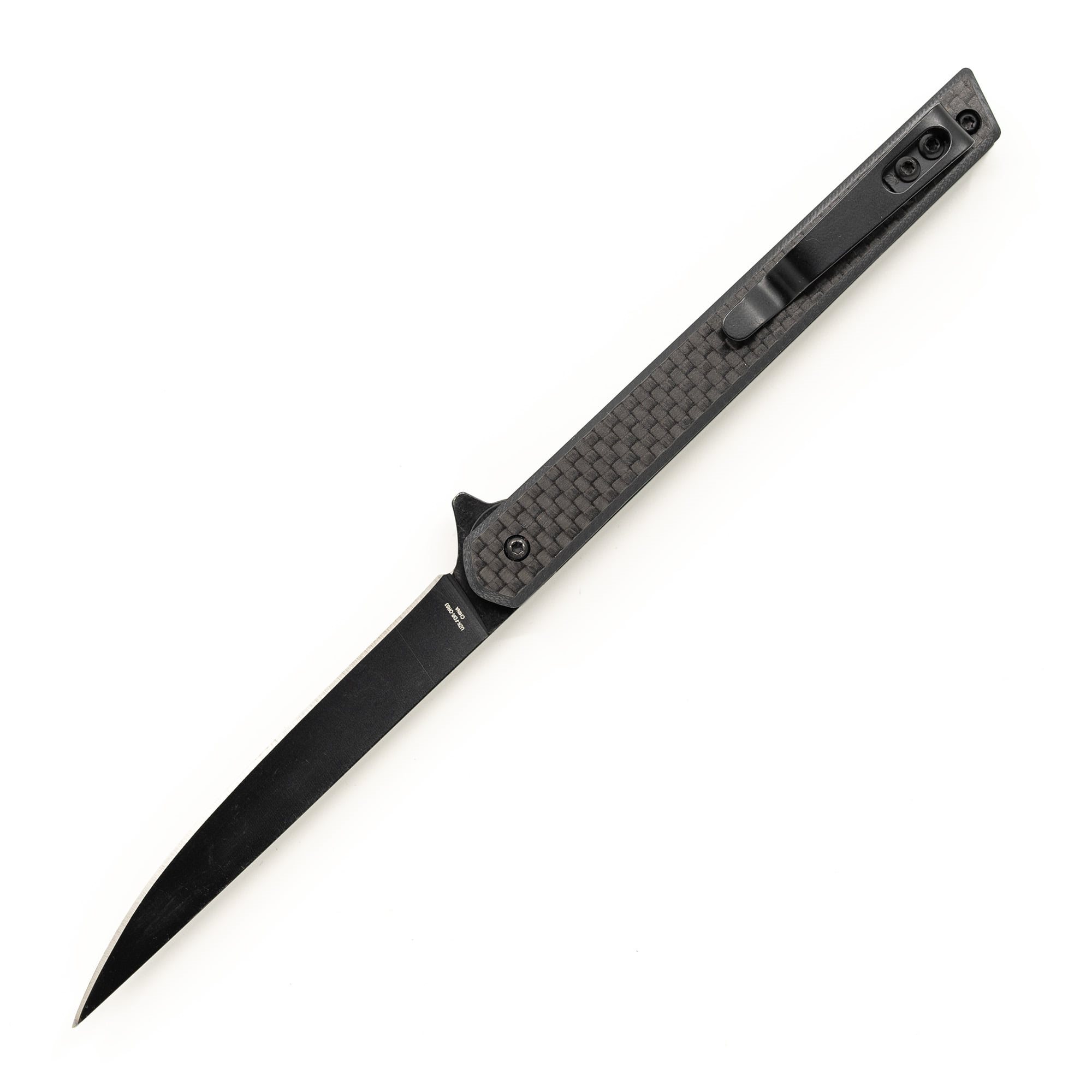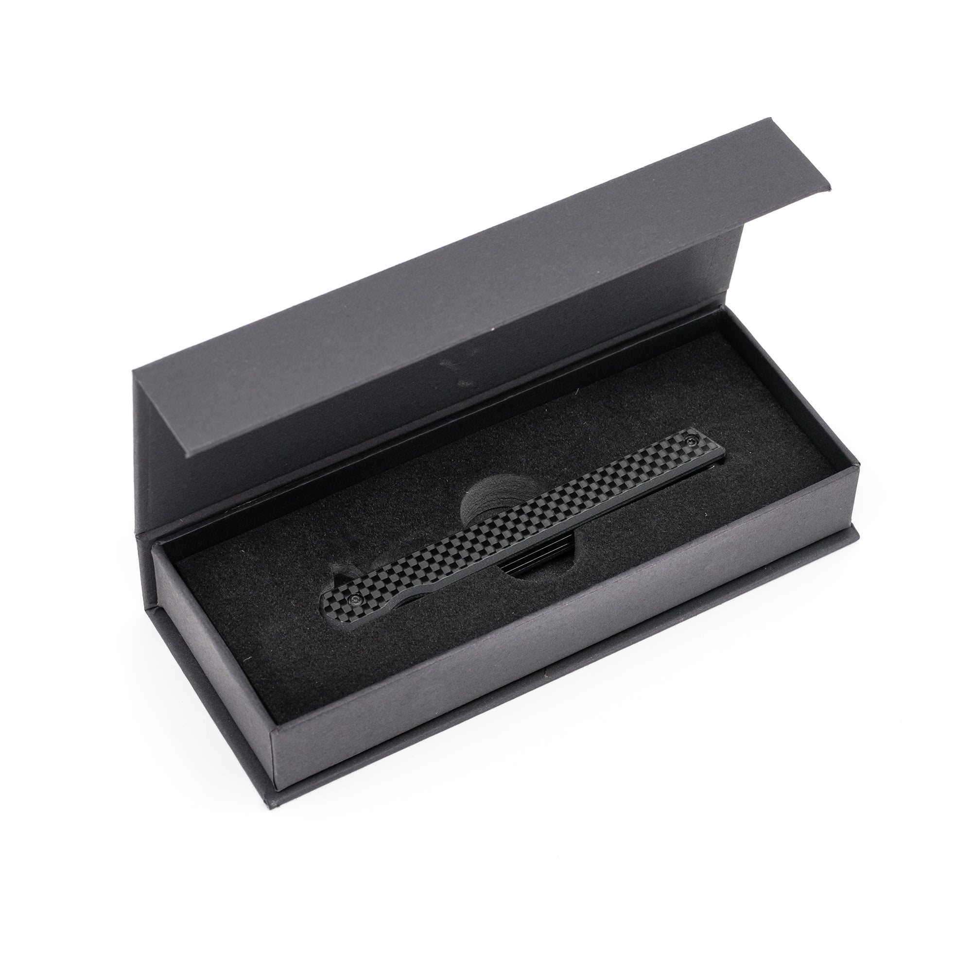 Couteau EDC léger avec une lame extrêmement étroite, livré dans un coffret cadeau. La lame lisse est fabriquée en acier inoxydable 440 avec un revêtement noir distinctif et est équipée d'un flipper pour une ouverture facile. Une fois ouverte, la lame est sécurisée par un verrouillage LinerLock fiable. Les manches du couteau sont fabriqués en fibre de carbone extrêmement résistante et sont équipés d'un clip de poche métallique pour un transport facile.