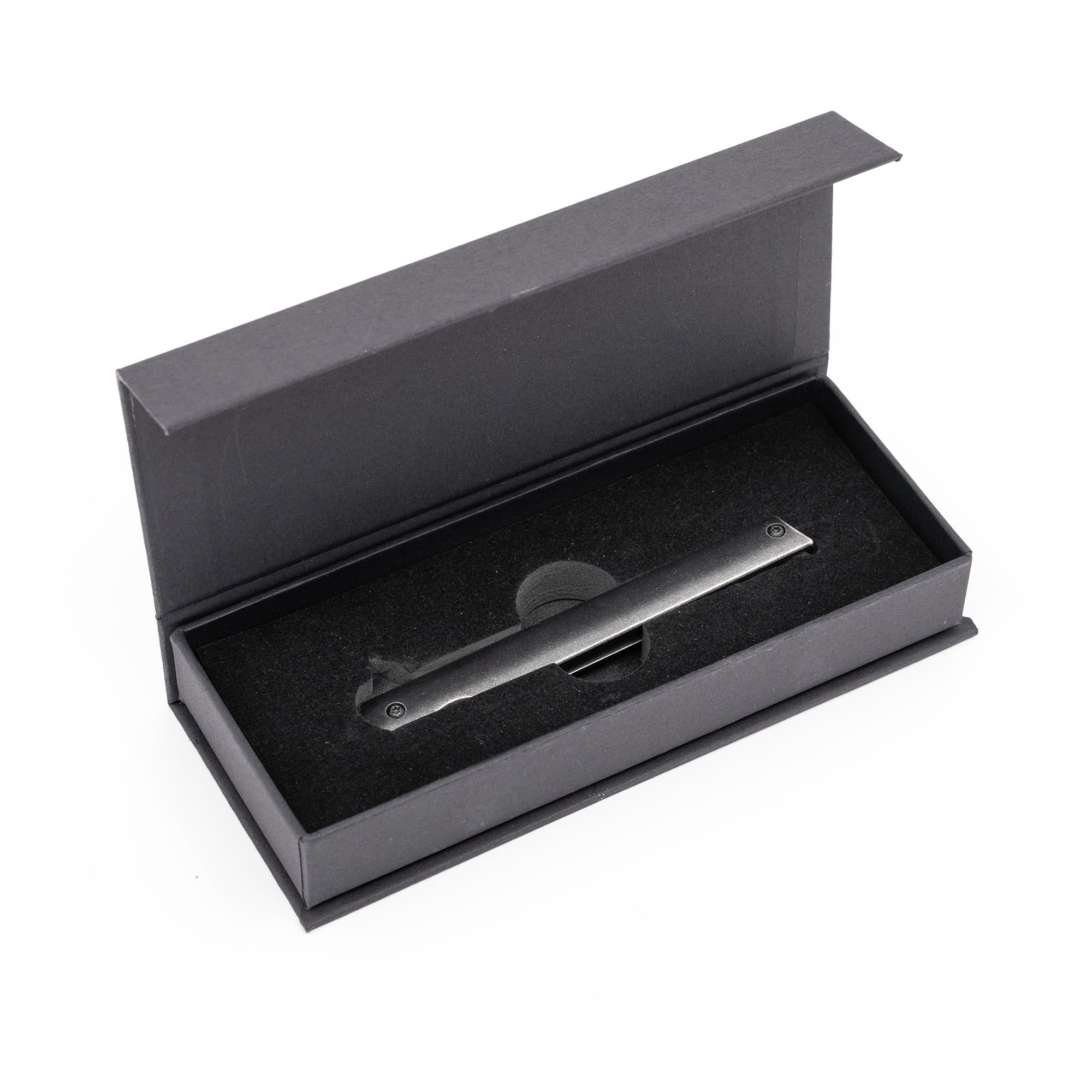 Couteau EDC léger avec une lame extrêmement étroite, livré dans un coffret cadeau. La lame lisse est fabriquée en acier inoxydable 440 avec un revêtement noir prononcé et est équipée d'un flipper pour une ouverture facile. Plus d'informations