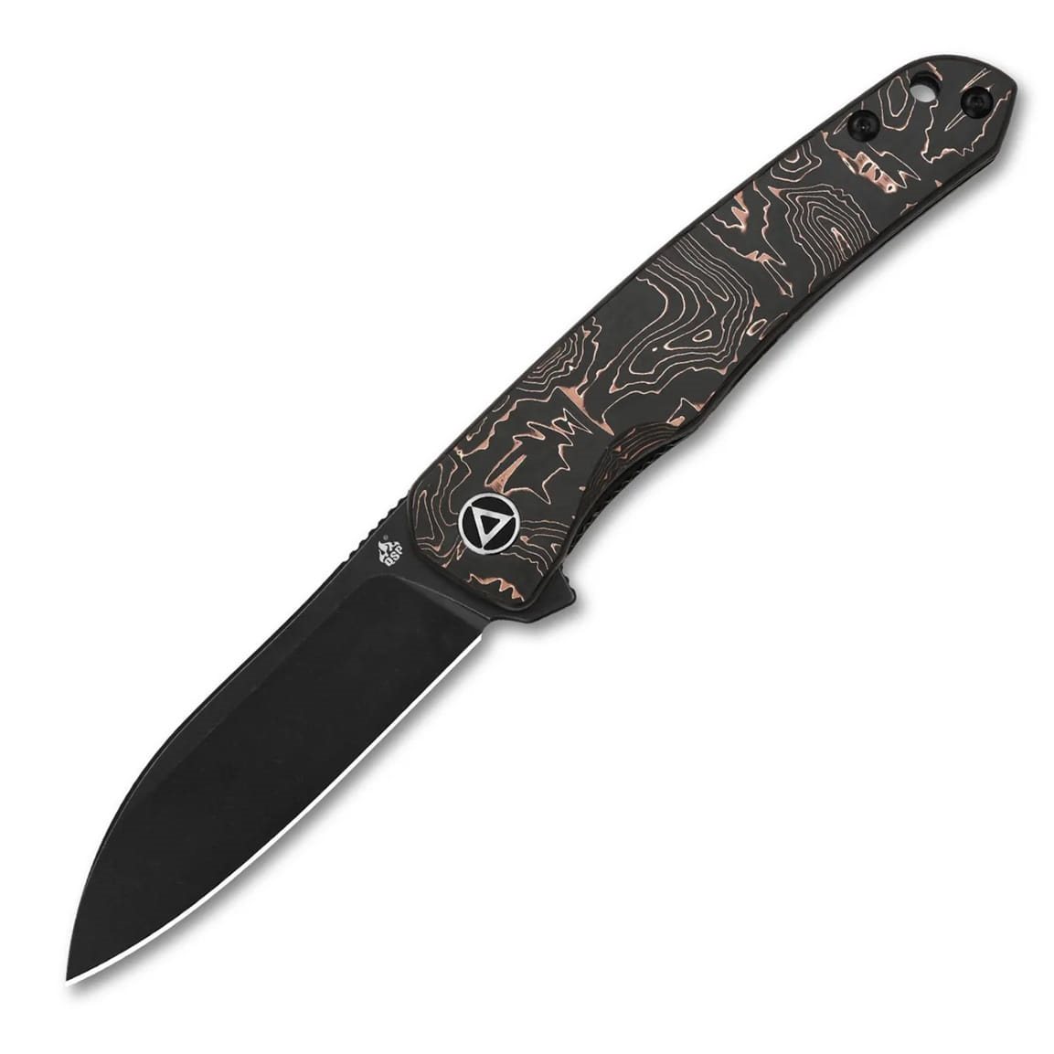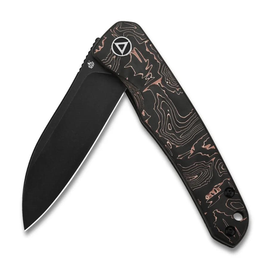 La lame en forme de pied de mouton avec un tranchant lisse est fabriquée en acier inoxydable S35VN d'une dureté de 58-60 HRC et noircie. Un flipper discret, qui sert également de garde, permet d'ouvrir facilement le couteau de la main droite ou gauche. La lame pivote sur un roulement à billes en céramique et est verrouillée en position ouverte par le système de verrouillage Liner Lock, le plus répandu. Les manches du couteau sont lisses, fabriqués en fibre de carbone entrelacée de feuille de cuivre (Copper Foil Carbon Fiber), ce qui crée un motif spécifique. Le manche est équipé d'un clip en titane de la même couleur que la lame et d'un trou pour passer un cordon de sécurité.