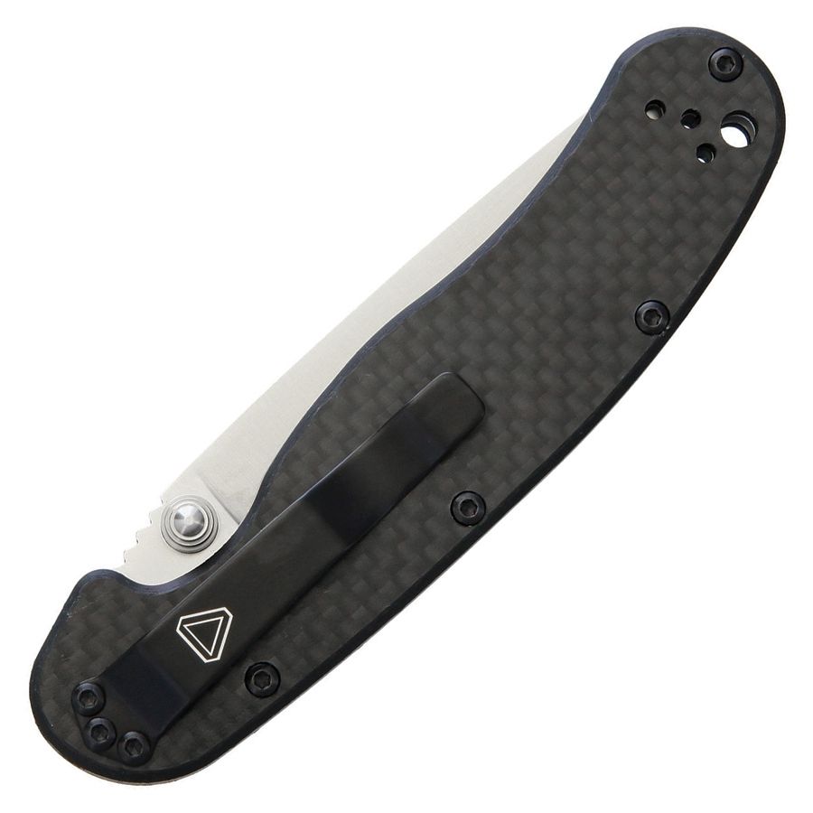 La lame à tranchant lisse est fabriquée en acier D2 de haute qualité. Sur la lame, vous trouverez la désignation de l'acier et du modèle du couteau, ainsi que le logo du fabricant et de la série. La lame légèrement mate est équipée d'un ergot double face pour faciliter l'ouverture du couteau d'une seule main. Sur le dos de la lame se trouve une dentelure qui facilite les travaux plus exigeants. équipée d'un ergot double face pour faciliter l'ouverture du couteau d'une seule main. Le dos de la lame est dentelé, ce qui facilite les travaux difficiles avec le couteau : il suffit d'y appuyer le pouce pour obtenir une prise plus sûre et plus stable. Le manche lisse avec un motif fin est composé de plaquettes en fibre de carbone, ce qui rend le couteau plus léger. Au dos, vous trouverez une vis métallique qui permet de régler la tension de la lame.