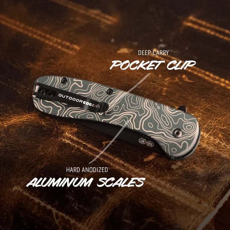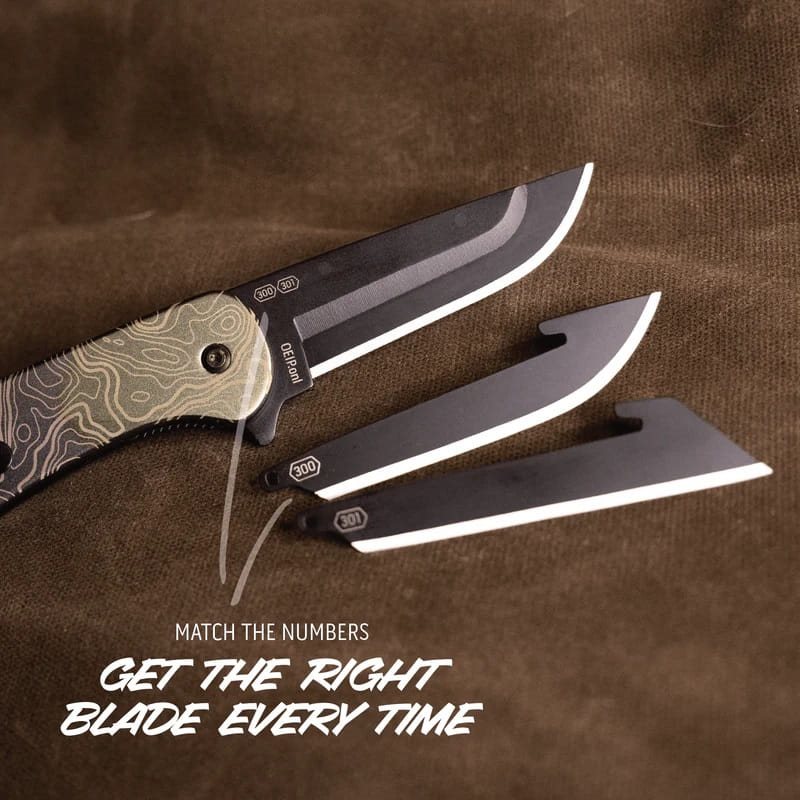 Couteau pliant avec ouverture assistée et lame interchangeable. La lame Drop point interchangeable et le porte-lame sont fabriqués en acier inoxydable 420J2 avec une finition noircie. Pour une ouverture facile d'une seule main, vous pouvez utiliser le flipper intégré. Le manche est légèrement incurvé pour une prise en main optimale et ses plaquettes sont en aluminium avec un imprimé rappelant une carte topographique. Il est bien entendu équipé d'un clip de poche en métal. Le couteau est livré avec trois lames interchangeables, deux à tranchant lisse et une à tranchant combiné.